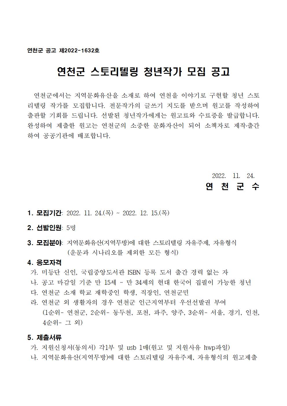 | 제목 | 연천군 스토리텔링 청년작가 모집 안내 | ||||