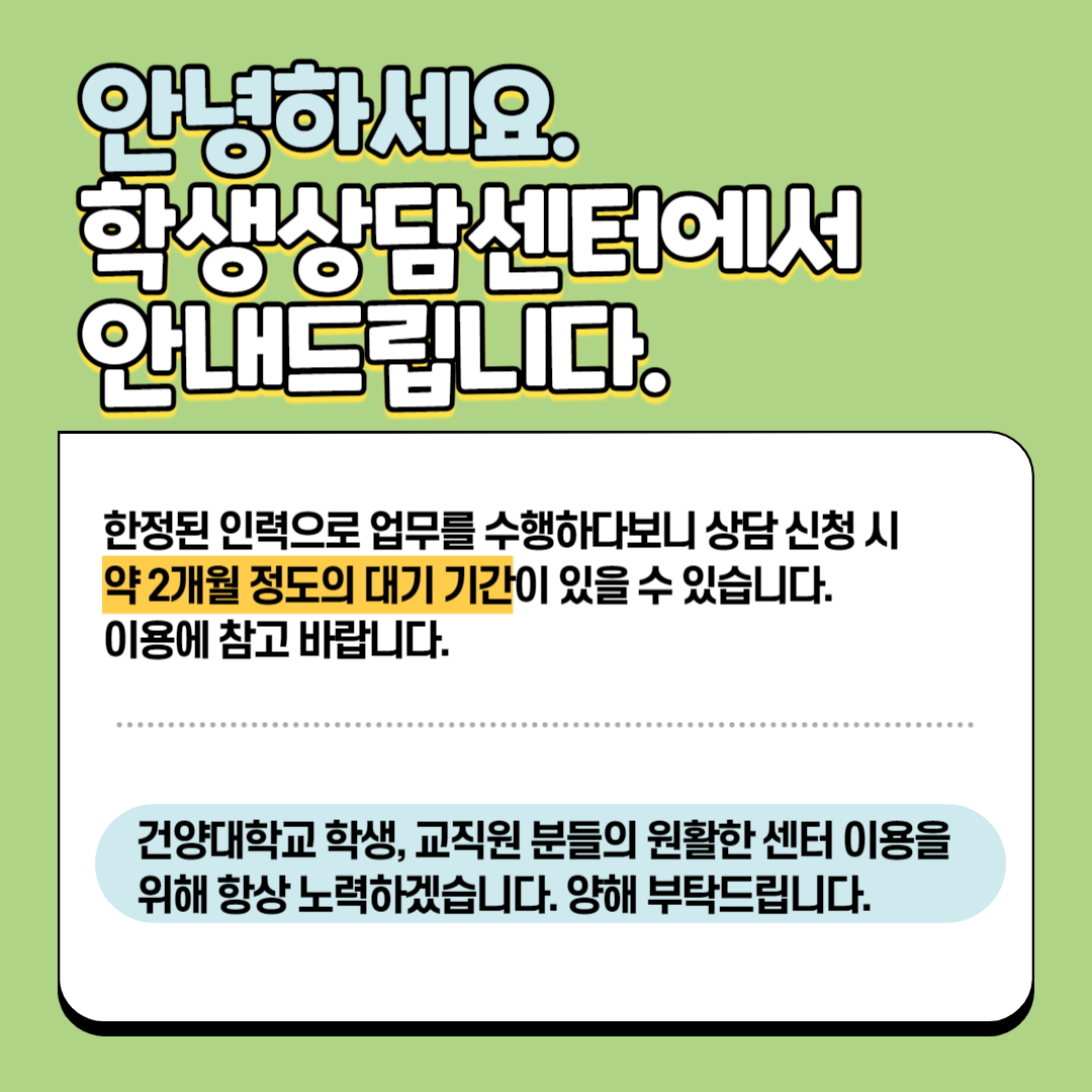 한정된 인력으로 업무를 수행하다보니 상담 신청 시 약 2개월 정도의 대기 기간이 있을 수 있습니다. 이용에 참고 바랍니다.