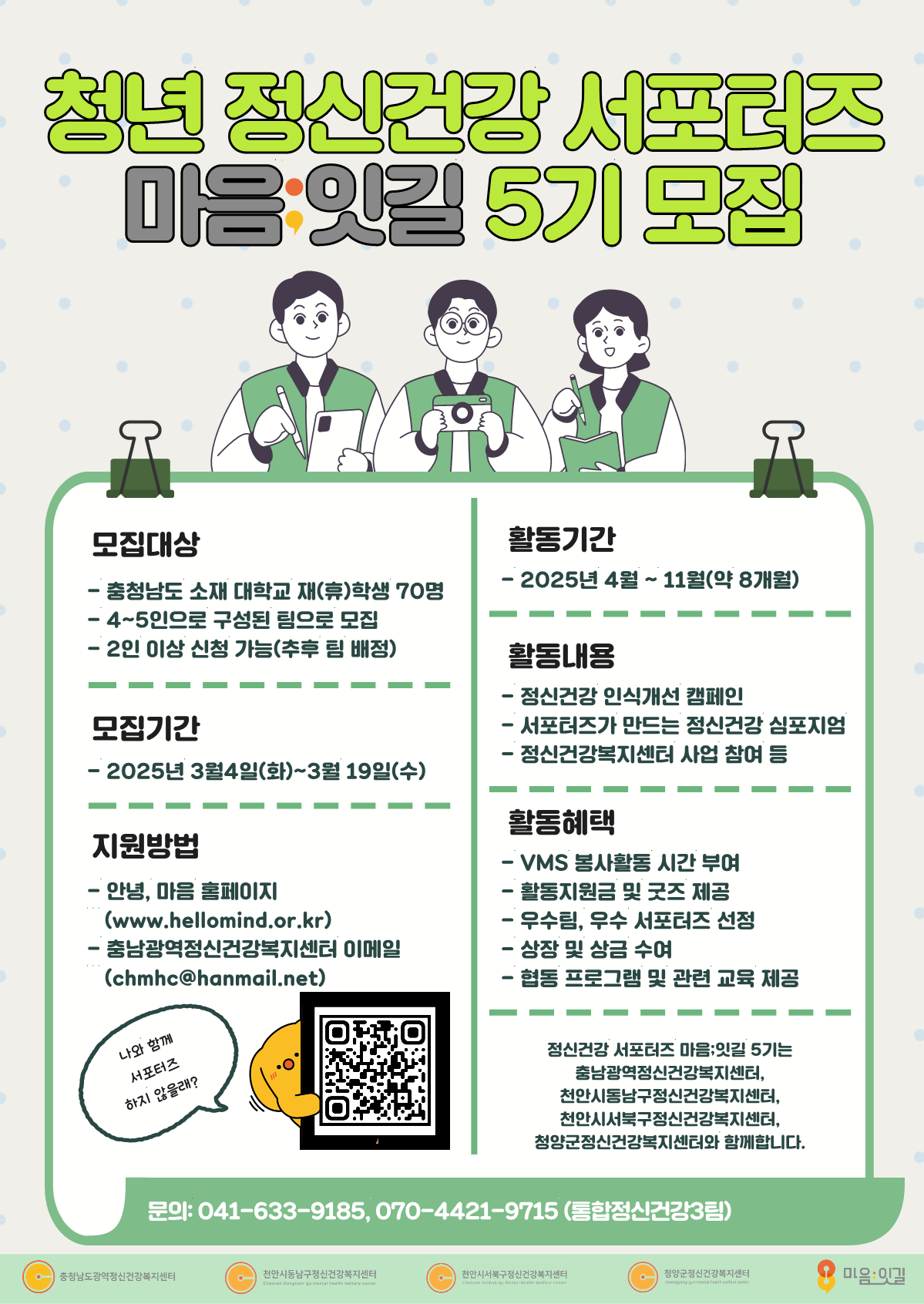 | 제목 | [충남광역정신건강복지센터] 청년 정신건강 서포터즈 마음;잇길 5기 모집 | ||||