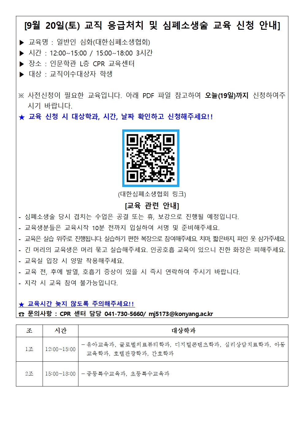 | 제목 | 교직 응급처치 및 심폐소생술 교육 신청 안내 | ||||