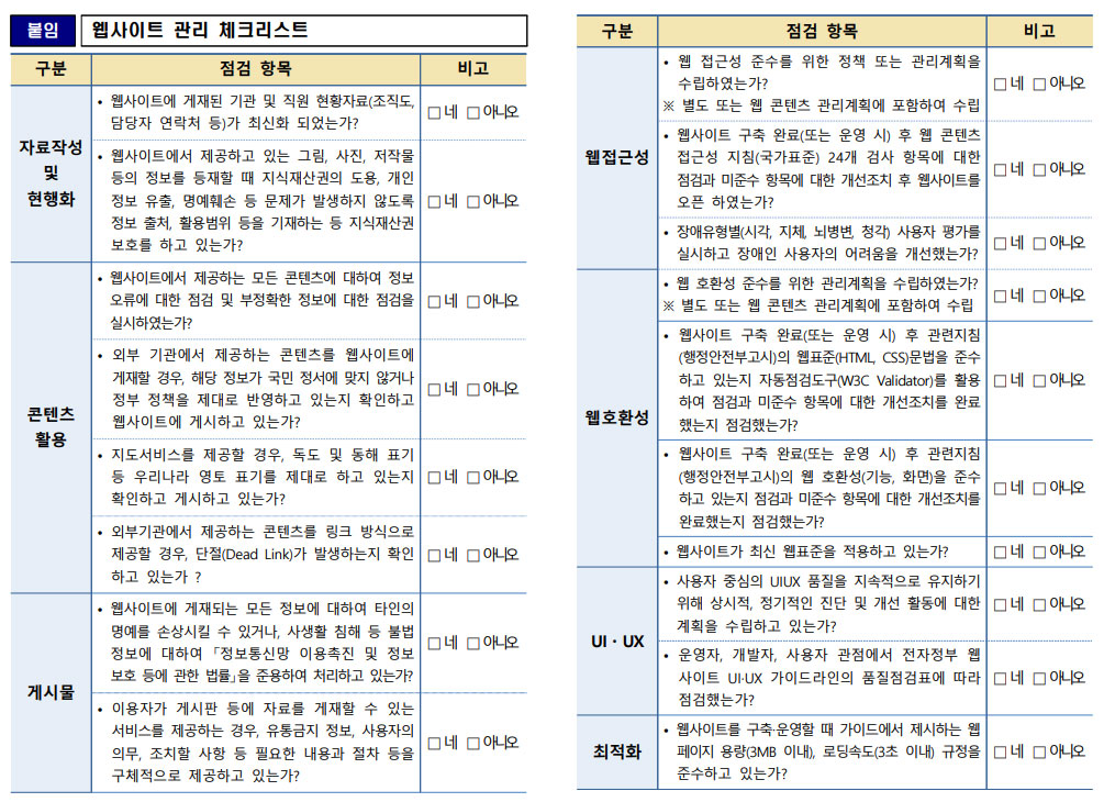- [홈페이지 관리 담당자 체크리스트] : 자료작성 및 현행화, 콘텐츠 활용, 게시물 - [시스템 관리자 체크리스트] : 웹접근성, 웹호환성, UI·UX, 최적화