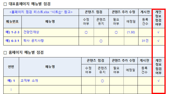 홈페이지의 점검 결과를 해당 양식에 작성한 후 기한내까지 홈페이지 점검 확인서 제출해 주시고, 콘텐츠 변경 및 수정 사항들은 통합정보시스템으로 신청바랍니다.