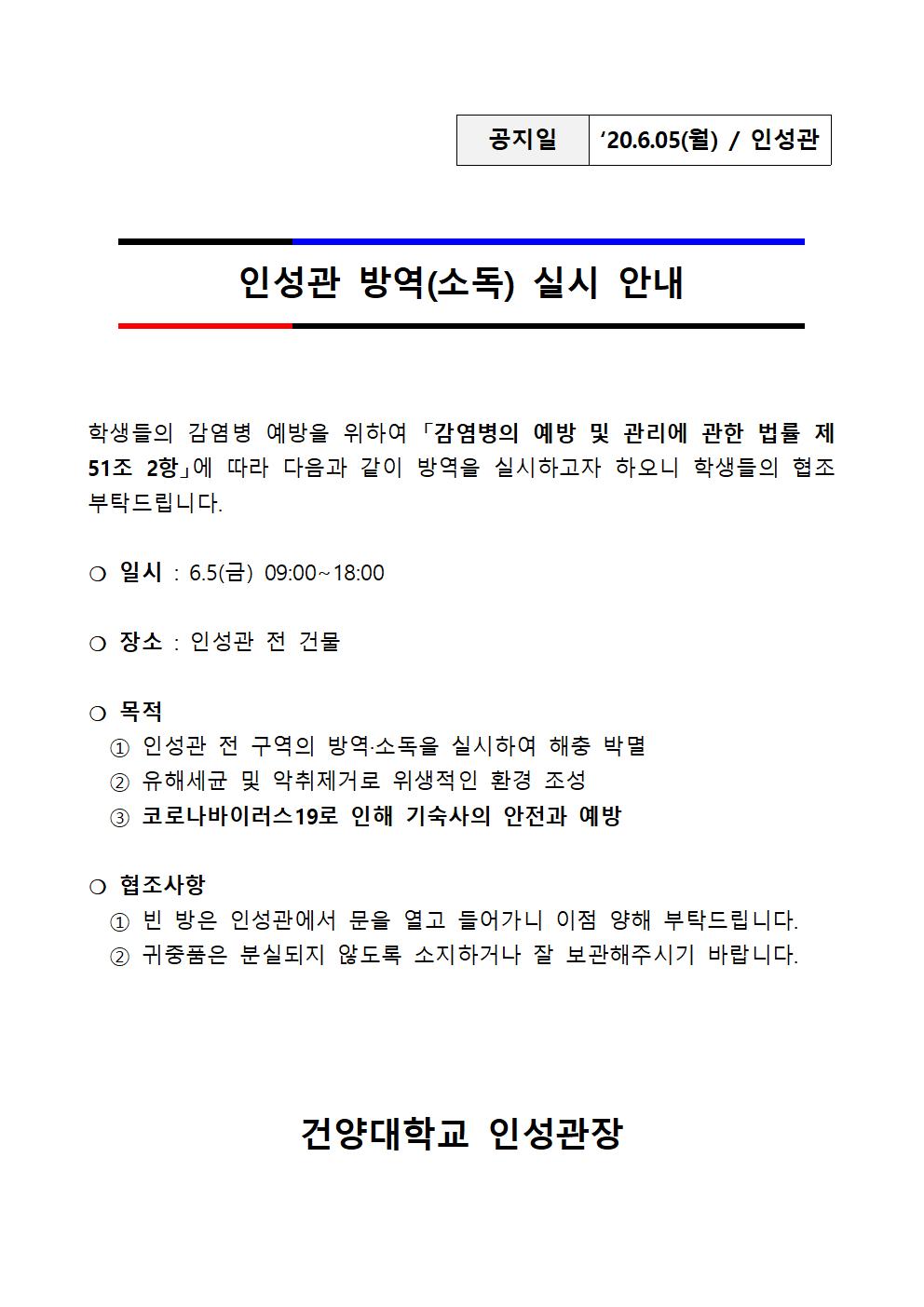 인성관 방역(소독) 안내-6.5자 글의 상세내용