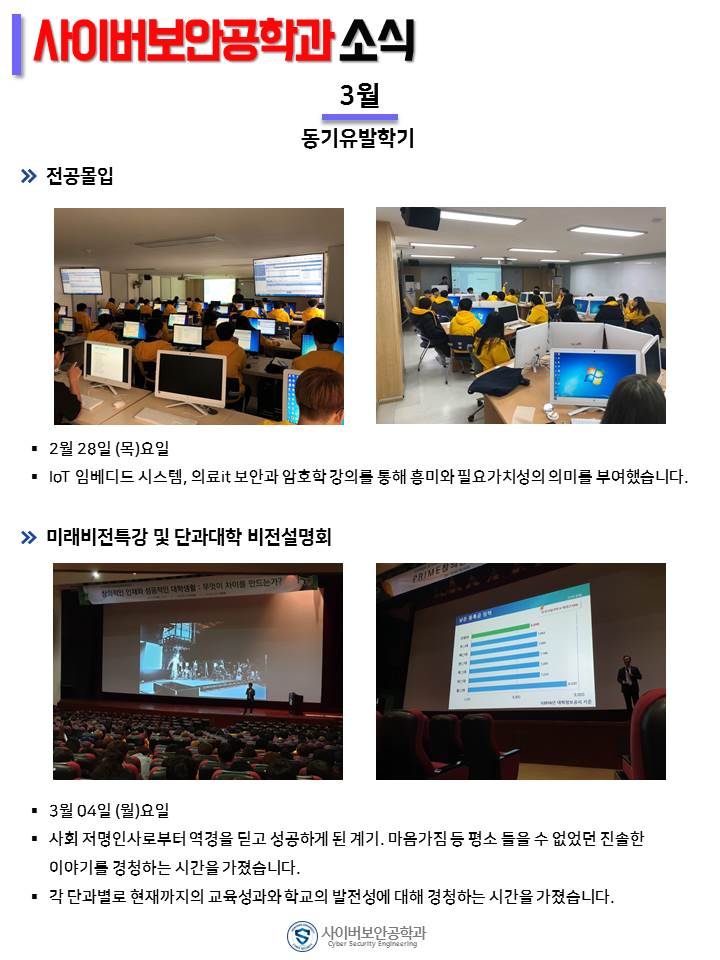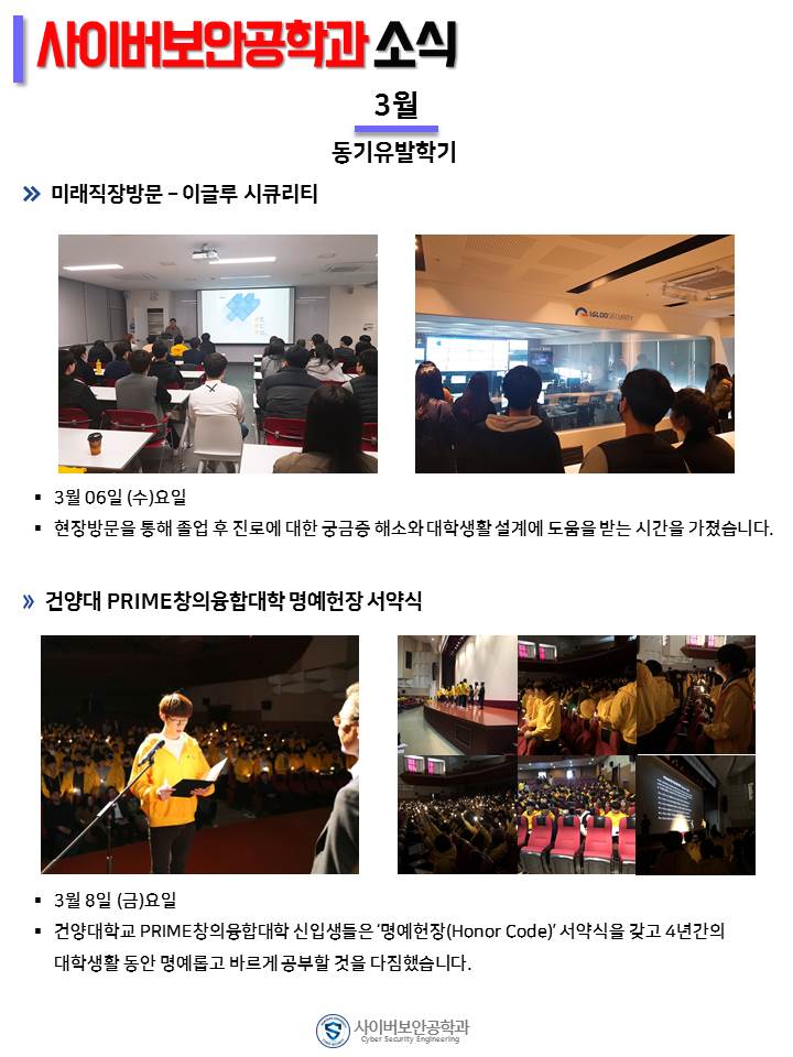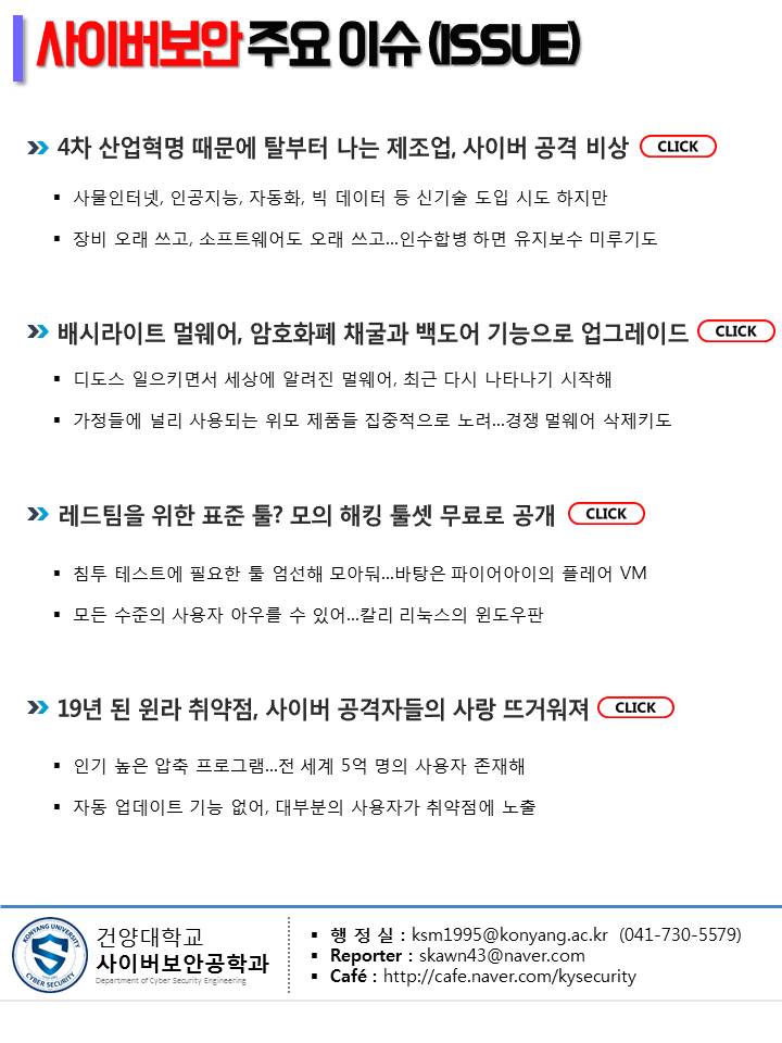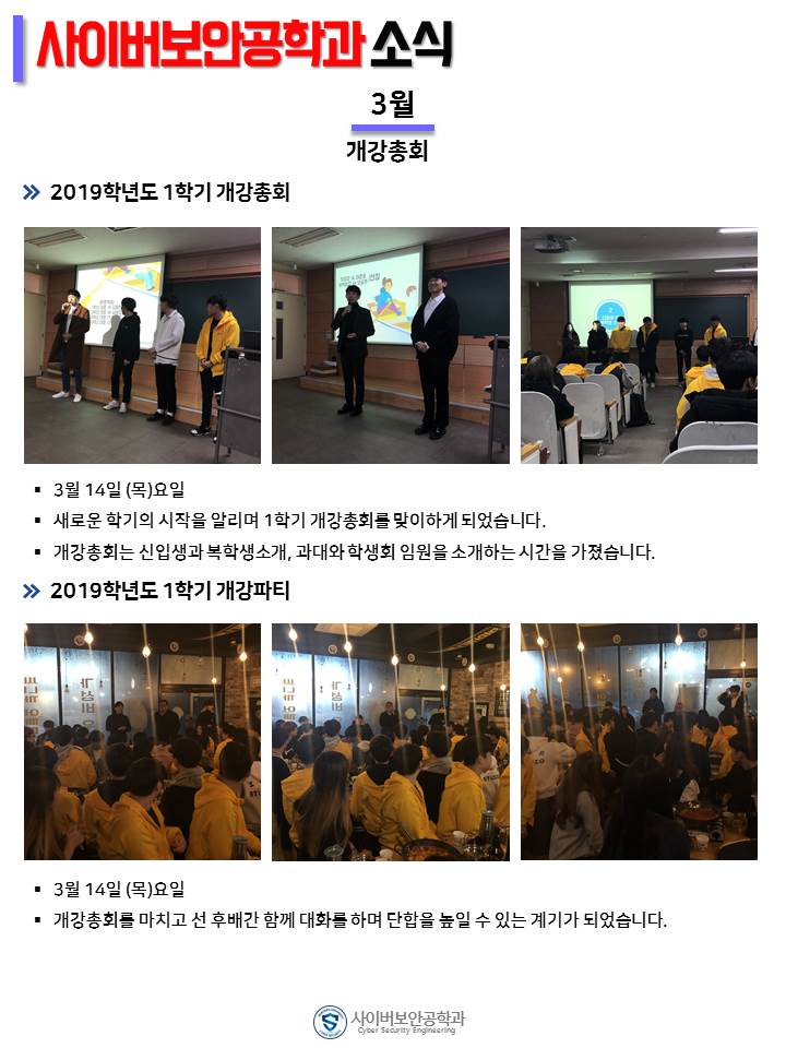 『 사이버보안공학과 보안매거진 2019-1호 』글의 상세내용을 확인하는 표로 제목, 부서명, 등록일, 조회, 첨부, 내용으로 나뉘어 설명합니다.