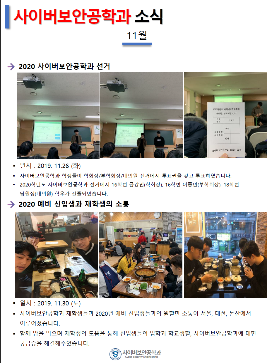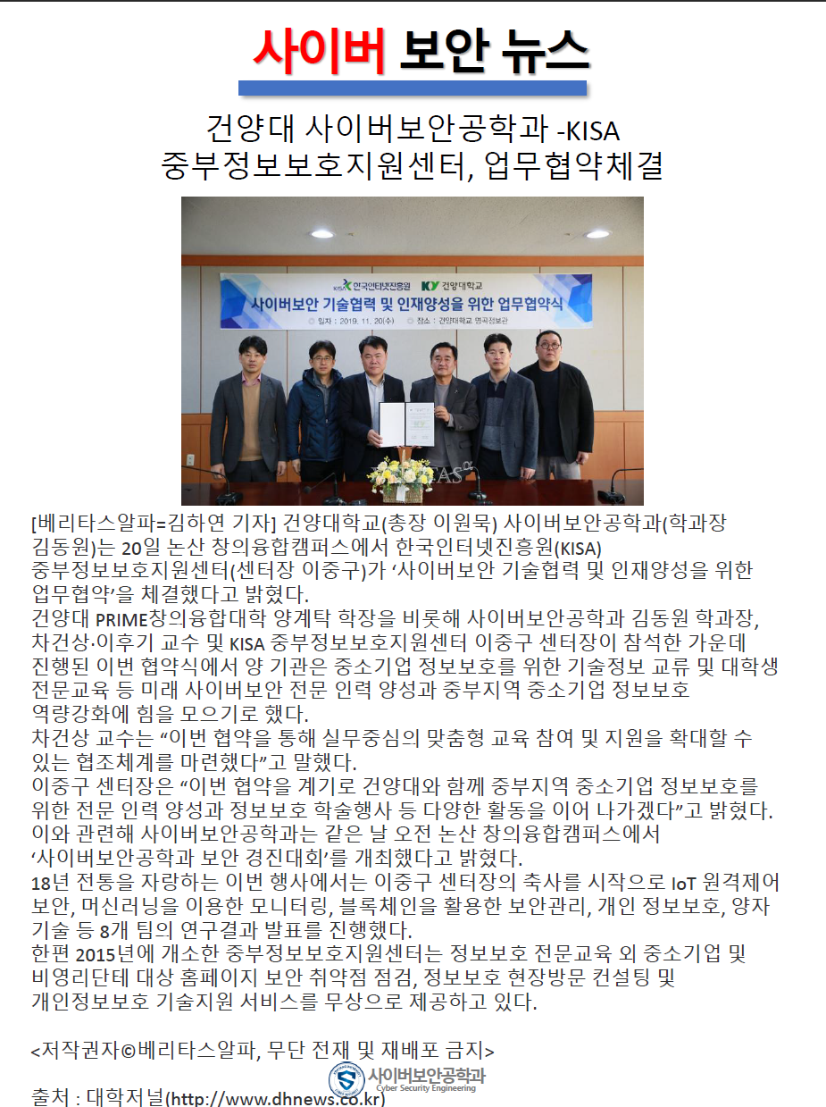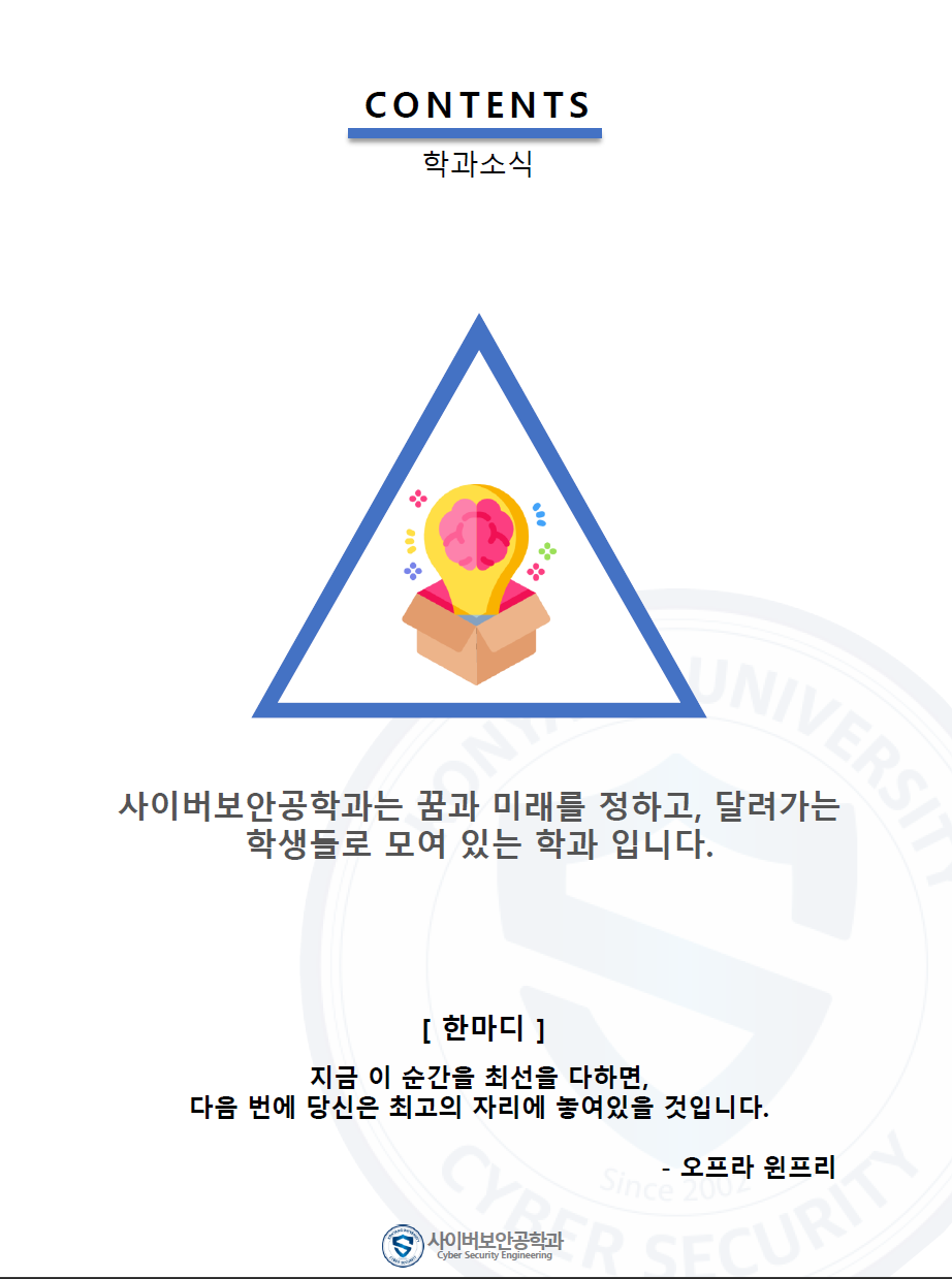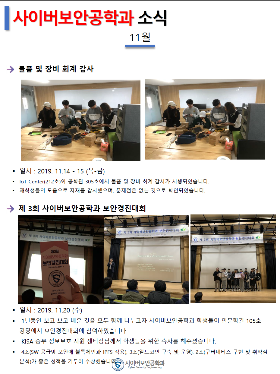『 사이버보안공학과 보안매거진 2019-5호 』글의 상세내용을 확인하는 표로 제목, 부서명, 등록일, 조회, 첨부, 내용으로 나뉘어 설명합니다.