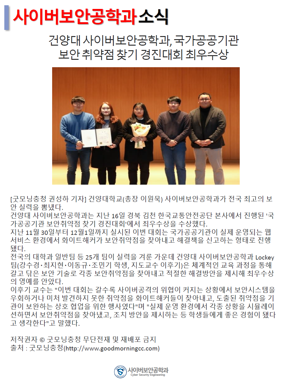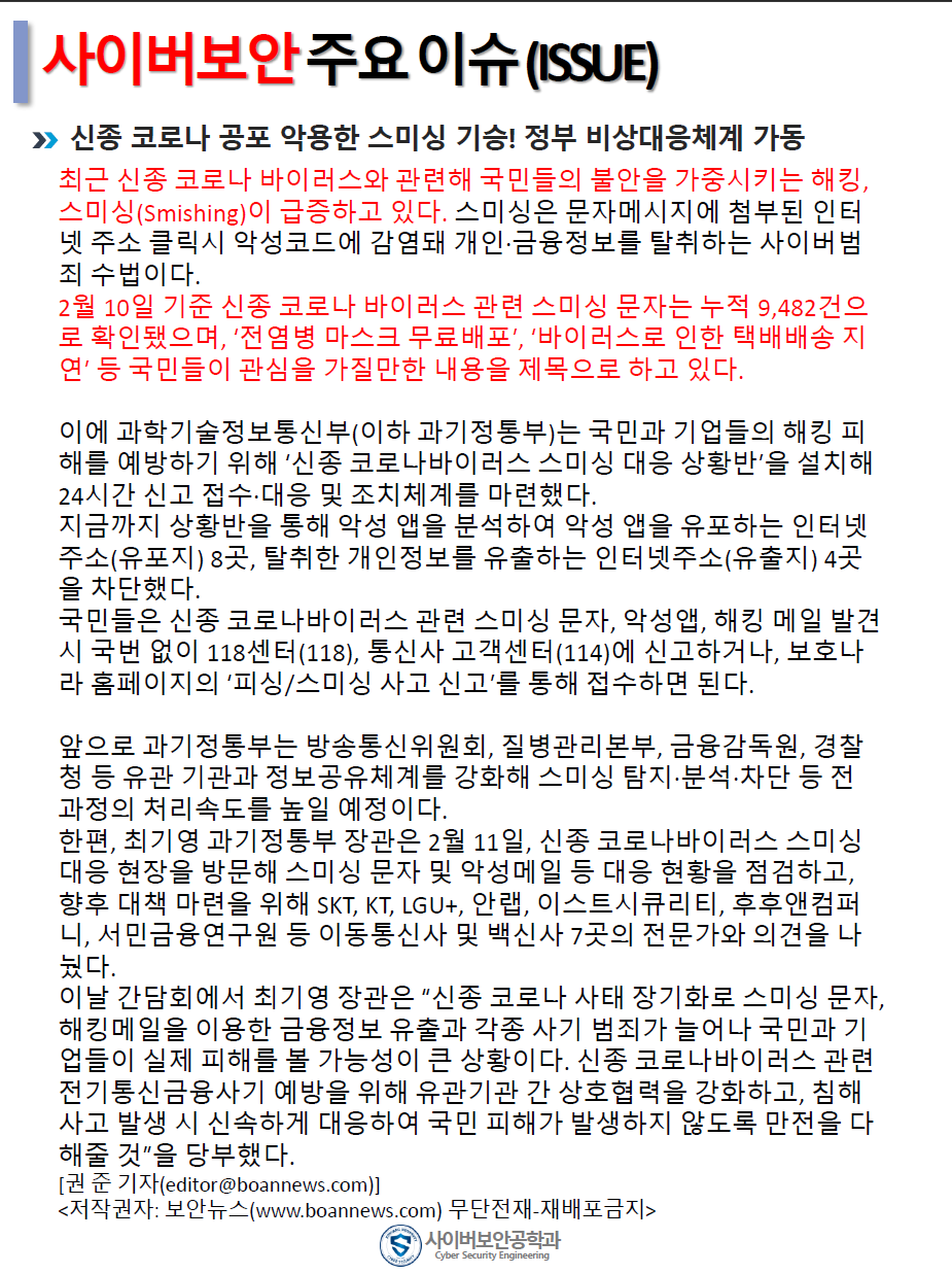 『 사이버보안공학과 보안매거진 2020-1호 』글의 상세내용을 확인하는 표로 제목, 부서명, 등록일, 조회, 첨부, 내용으로 나뉘어 설명합니다.