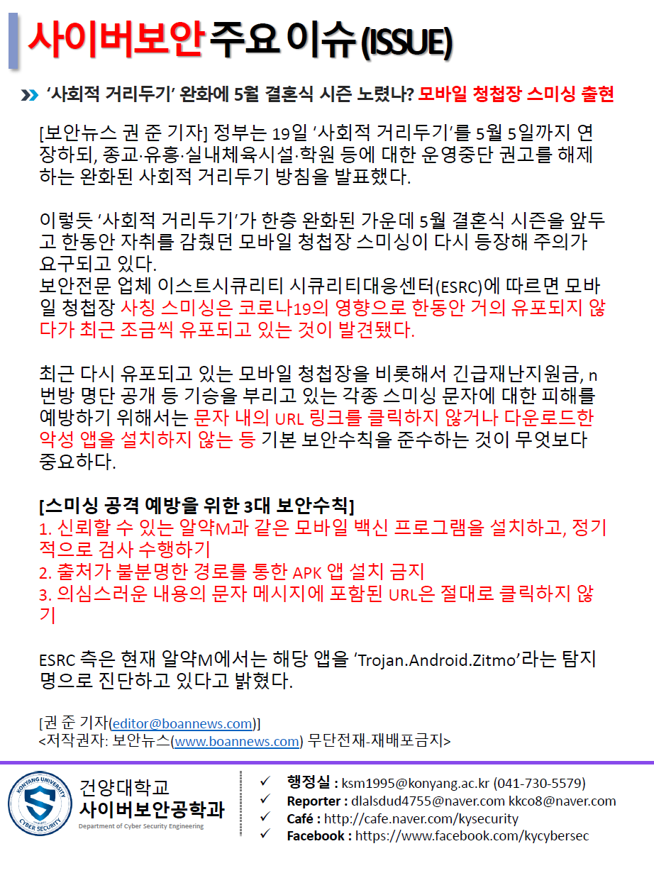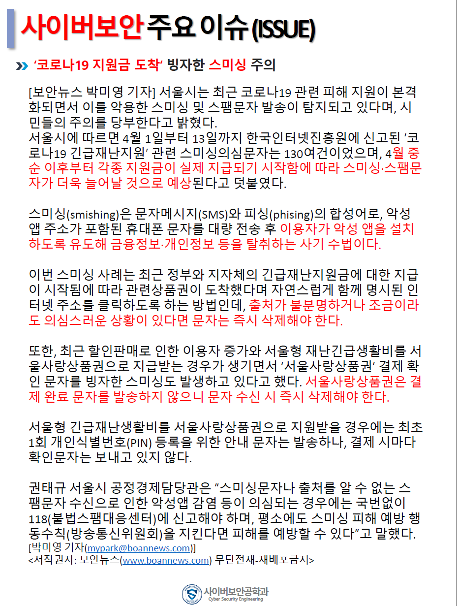 『 사이버보안공학과 보안매거진 2020-2호 』글의 상세내용을 확인하는 표로 제목, 부서명, 등록일, 조회, 첨부, 내용으로 나뉘어 설명합니다.