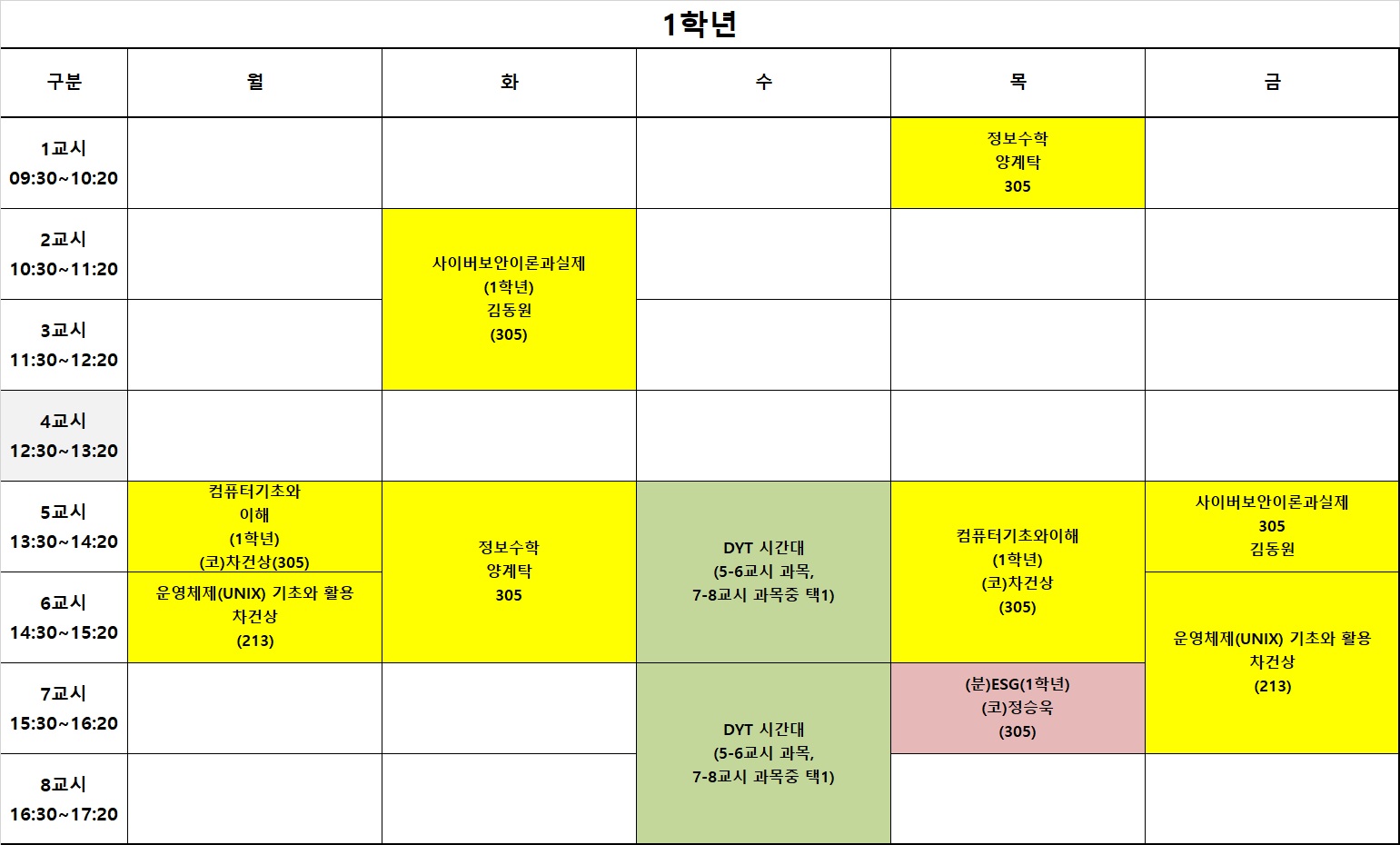 6. 1학기 시간표 안내 (기본시간표) * 본 시간표는 전공과 교양필수만 있는 시간표입니다. 여기에 개강 후 교양 한과목과 DYT (1학년 전용과목) 1과목 을 추가로 신청하셔야 합니다.