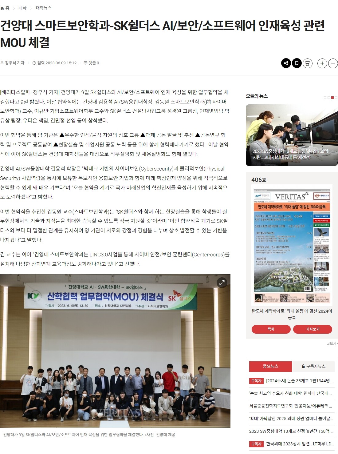 『 건양대 스마트보안학과-SK쉴더스 AI/보안/소프트웨어 인재육성 관련 MOU 체결 』글의 상세내용을 확인하는 표로 제목, 부서명, 등록일, 조회, 첨부, 내용으로 나뉘어 설명합니다.
