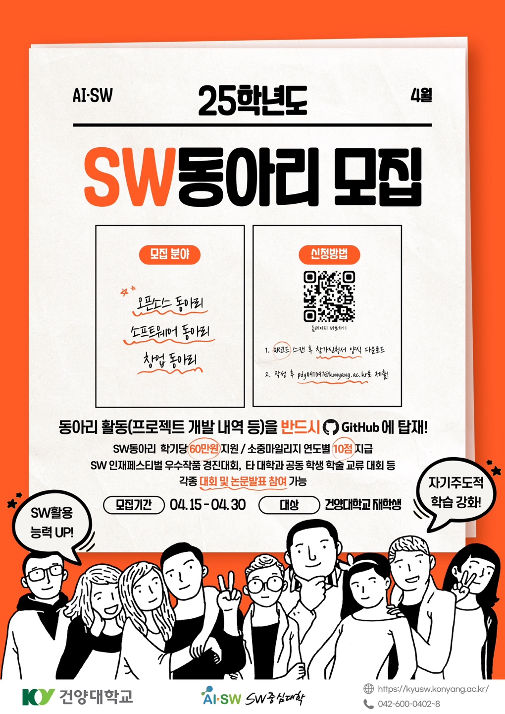『 25학년도 SW동아리 모집 안내 』글의 상세내용을 확인하는 표로 제목, 부서명, 등록일, 조회, 첨부, 내용으로 나뉘어 설명합니다.