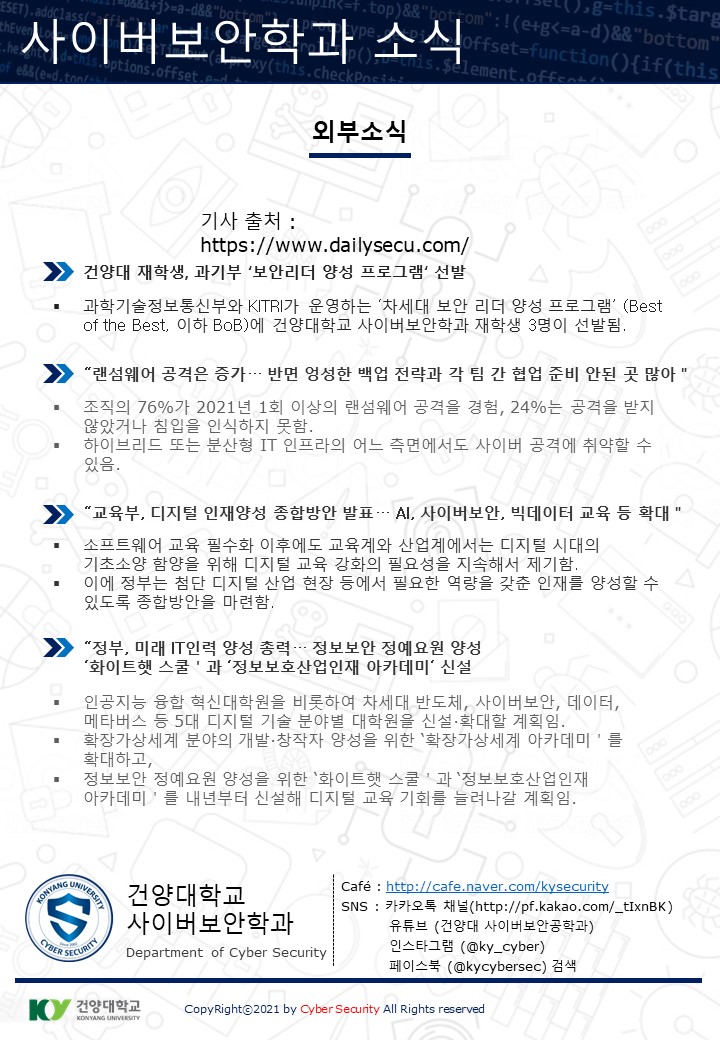 『 사이버보안학과 보안매거진 2022-3호 』글의 상세내용을 확인하는 표로 제목, 부서명, 등록일, 조회, 첨부, 내용으로 나뉘어 설명합니다.
