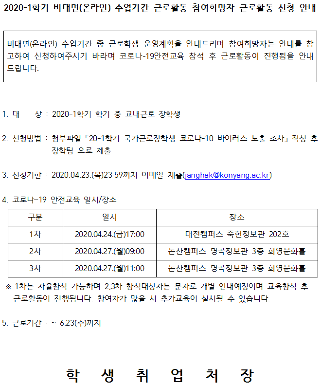 | 제목 | 2020-1학기 비대면(온라인) 수업기간 근로활동 참여희망자 근로활동 신청 안내 | ||||