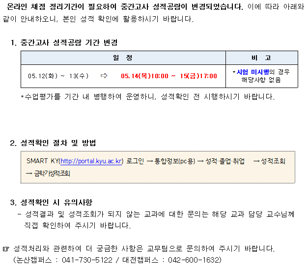 『 2020학년도 1학기 중간고사 성적공람 안내(수정) 』글의 상세내용을 확인하는 표로 제목, 부서명, 등록일, 조회, 첨부, 내용으로 나뉘어 설명합니다.