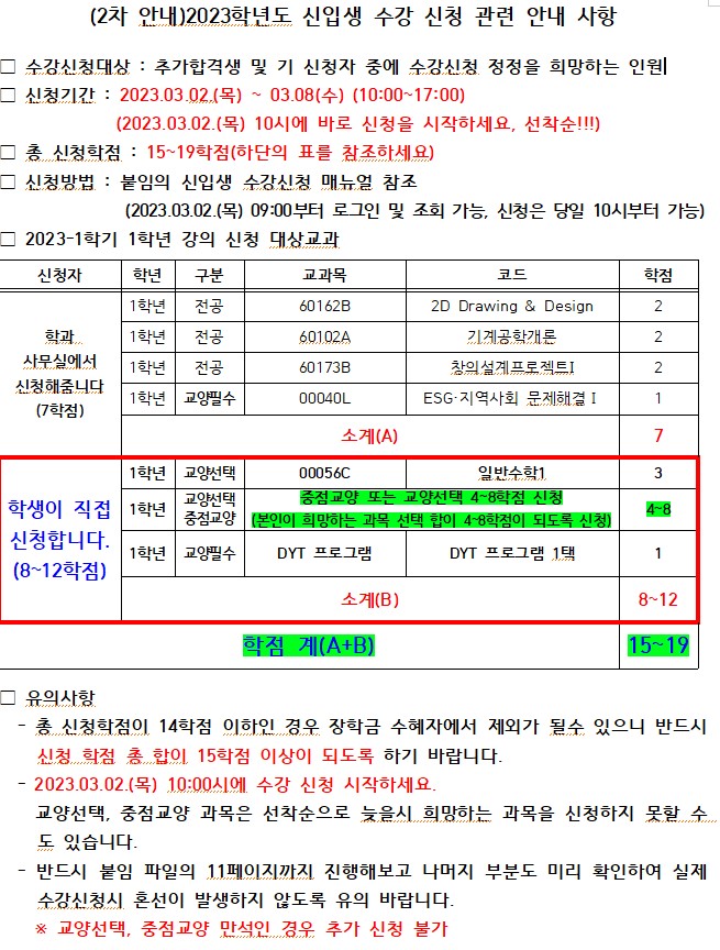 | 제목 | (2차 안내)2023학년도 신입생 수강 신청 관련 안내 사항_추가합격자 및 정정인원 | ||||
