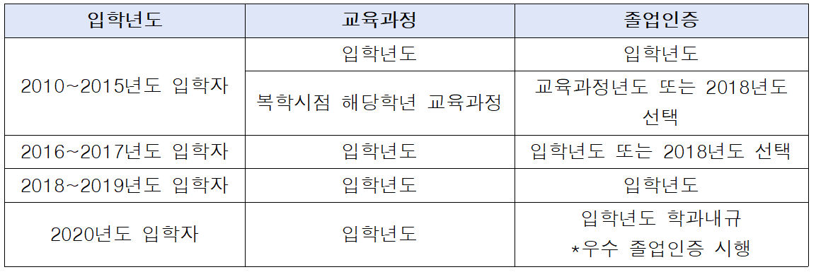 마. 참고사항 : 입학년도별 교육과정 및 졸업인증 적용년도