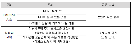 교수학습지원센터에서는 신입생들의 대학생활 적응력 향상과 자기주도학습 역량 향상을 위해 LMS안내 숏폼 제작 및 온라인 학습법 교육을 실시하고 있습니다.