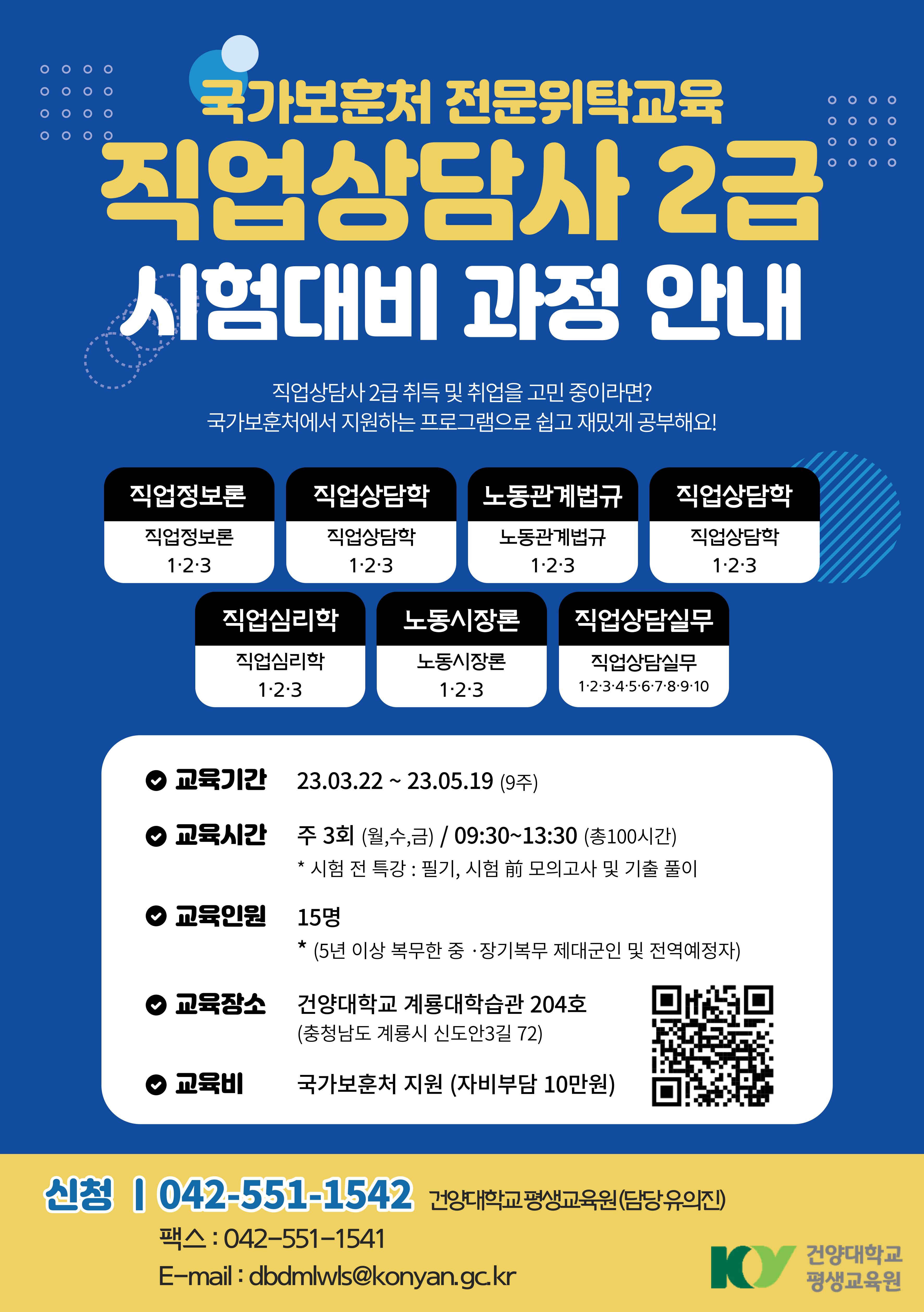 | 제목 | [국가보훈처 전문위탁교육] 직업상담사 2급 시험대비 과정 안내 | ||||