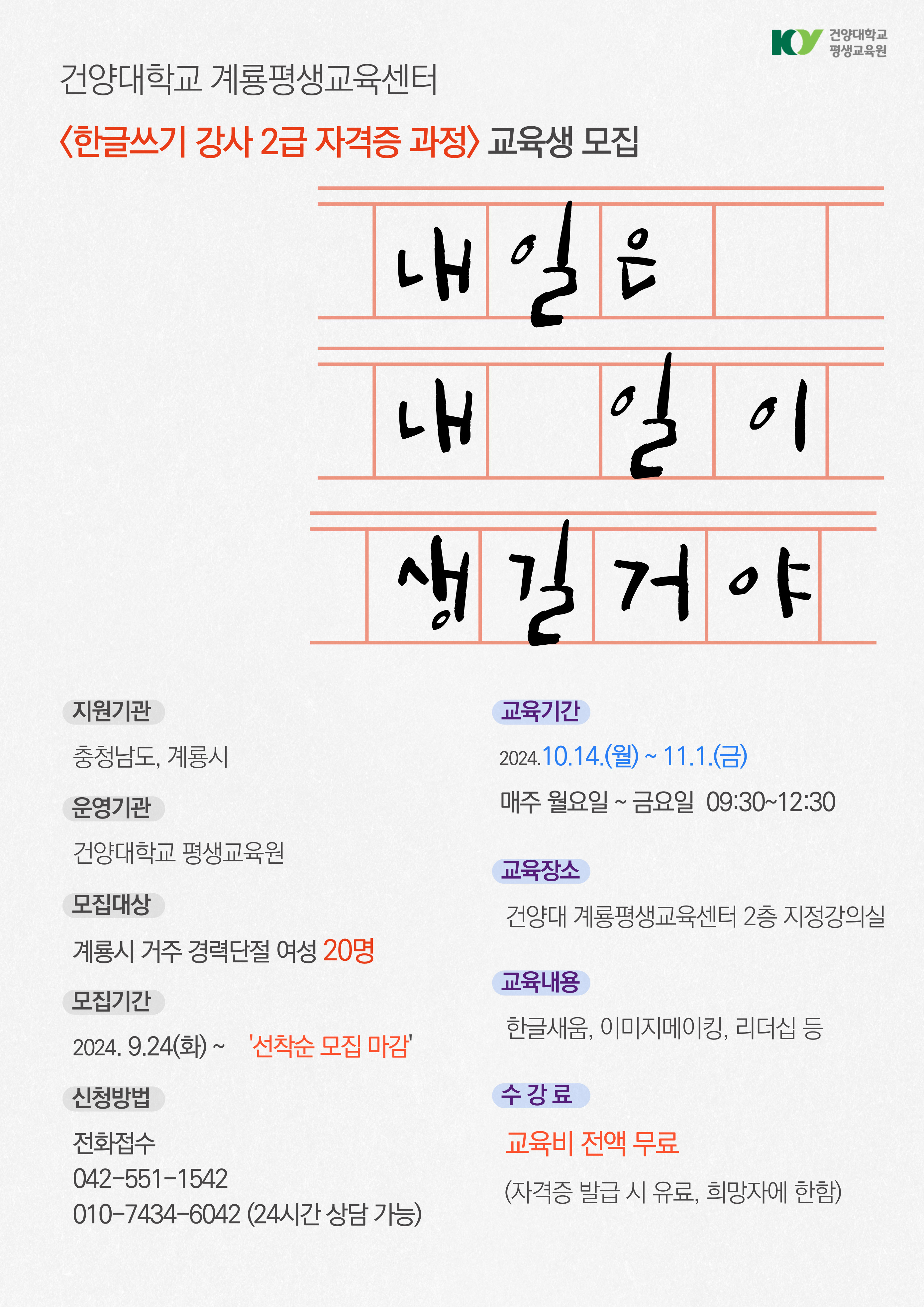 제목 (계룡) 경력단절여성 - 한글쓰기강사 자격증과정 교육생 모집