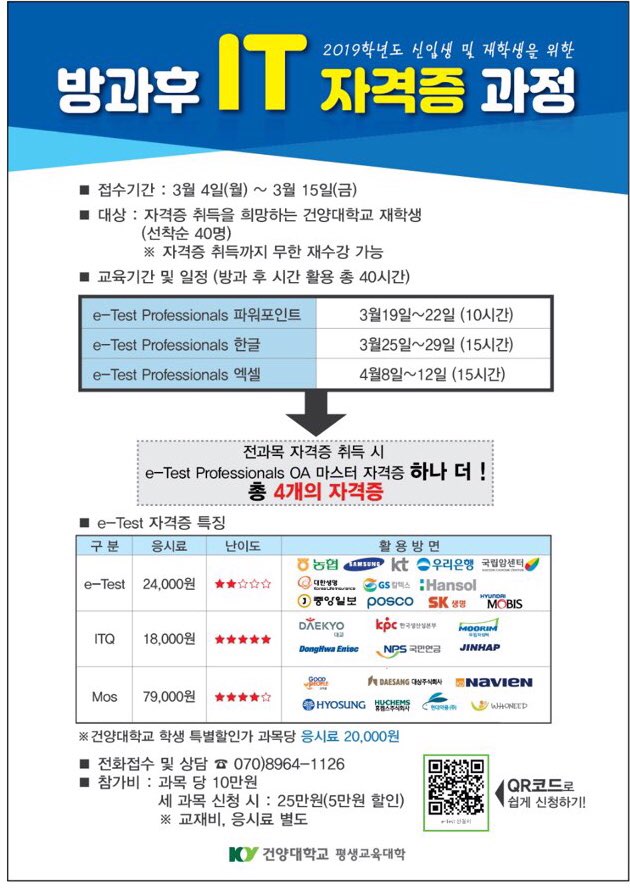 | 제목 | 방가 후 IT자격증(E-TEST) 과정 수강생 모집 | ||||