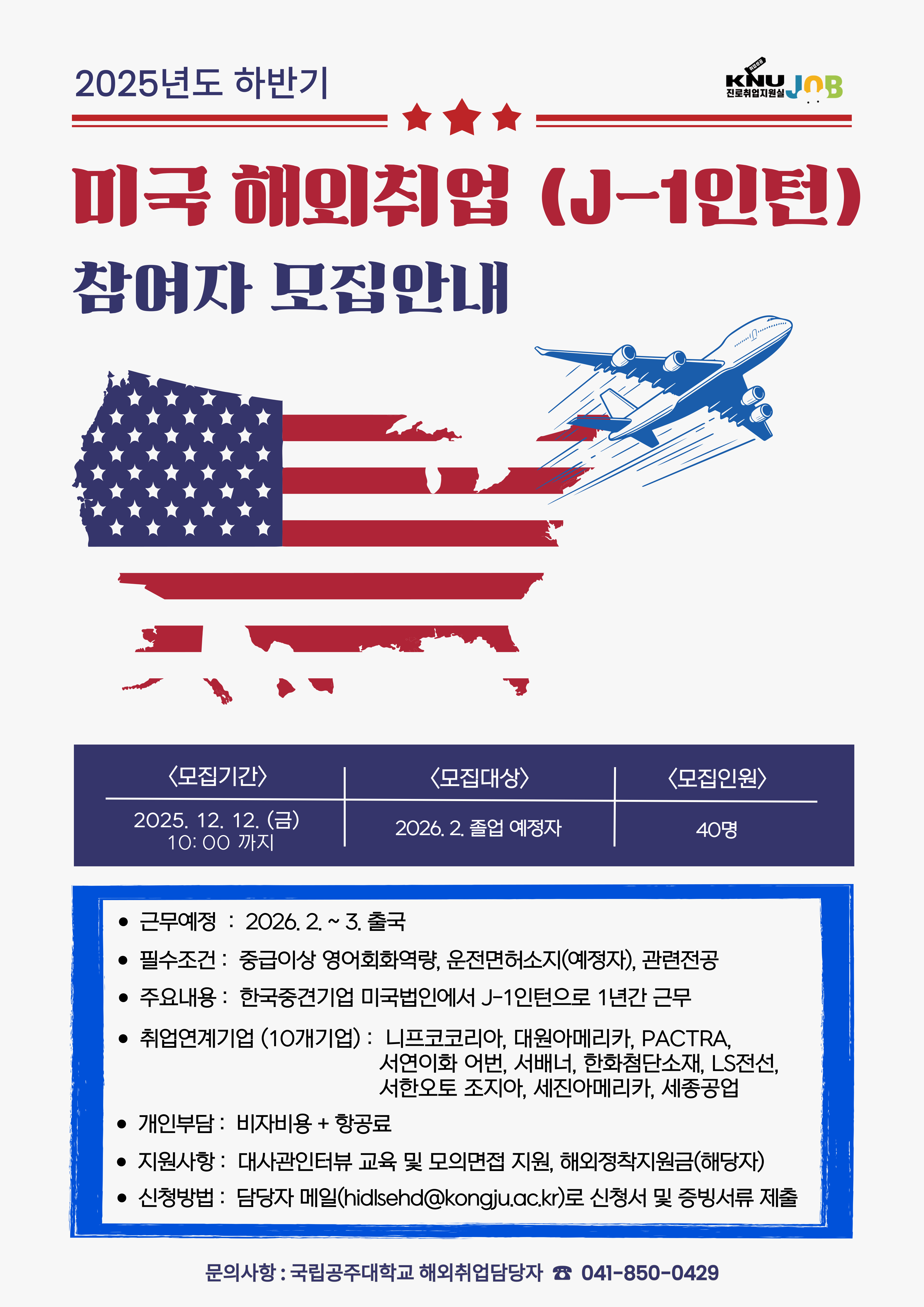 | 제목 | 2025년도 하반기 미국 해외취업(J-1인턴) 참여자 모집안내(~12/12) | ||||