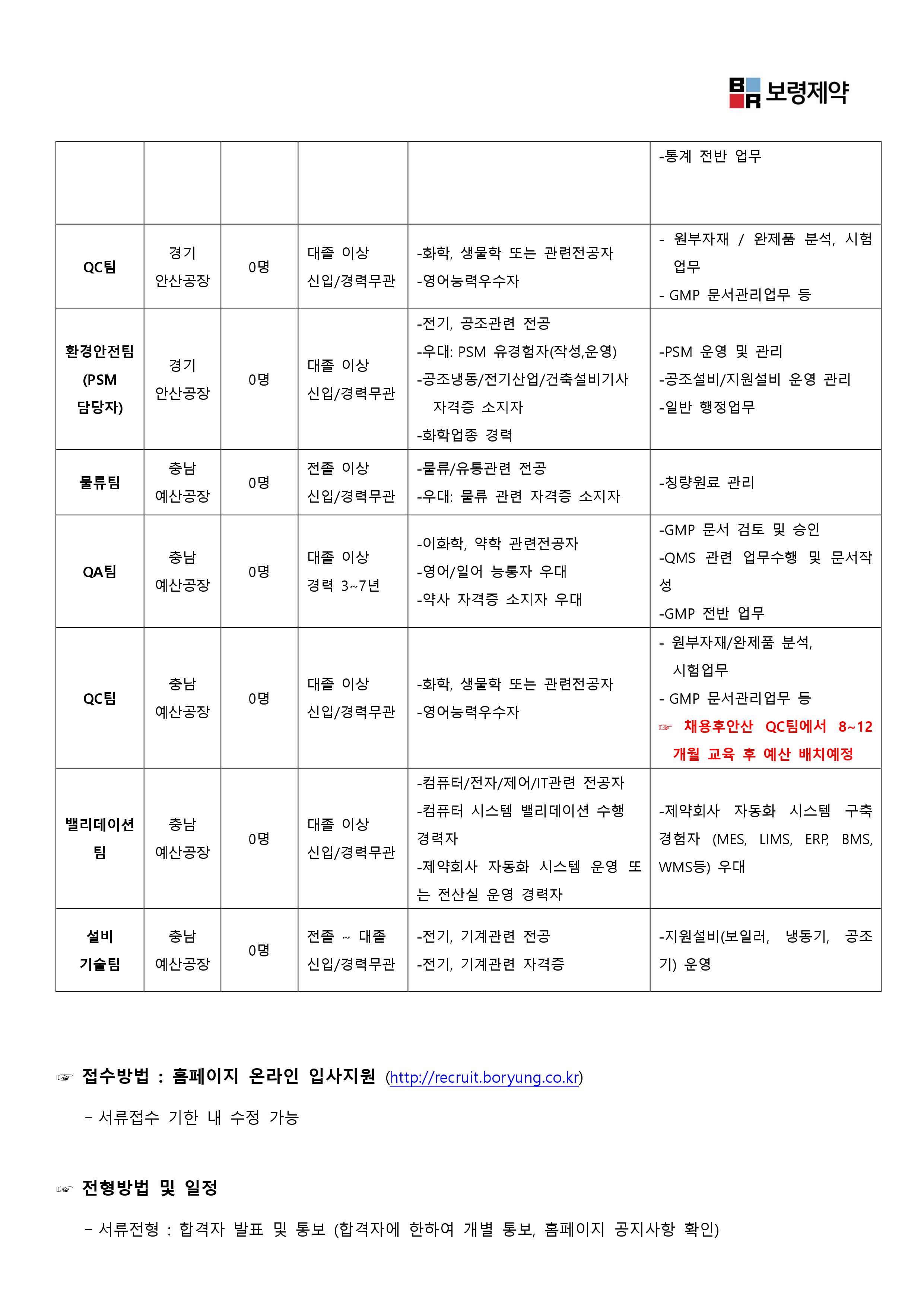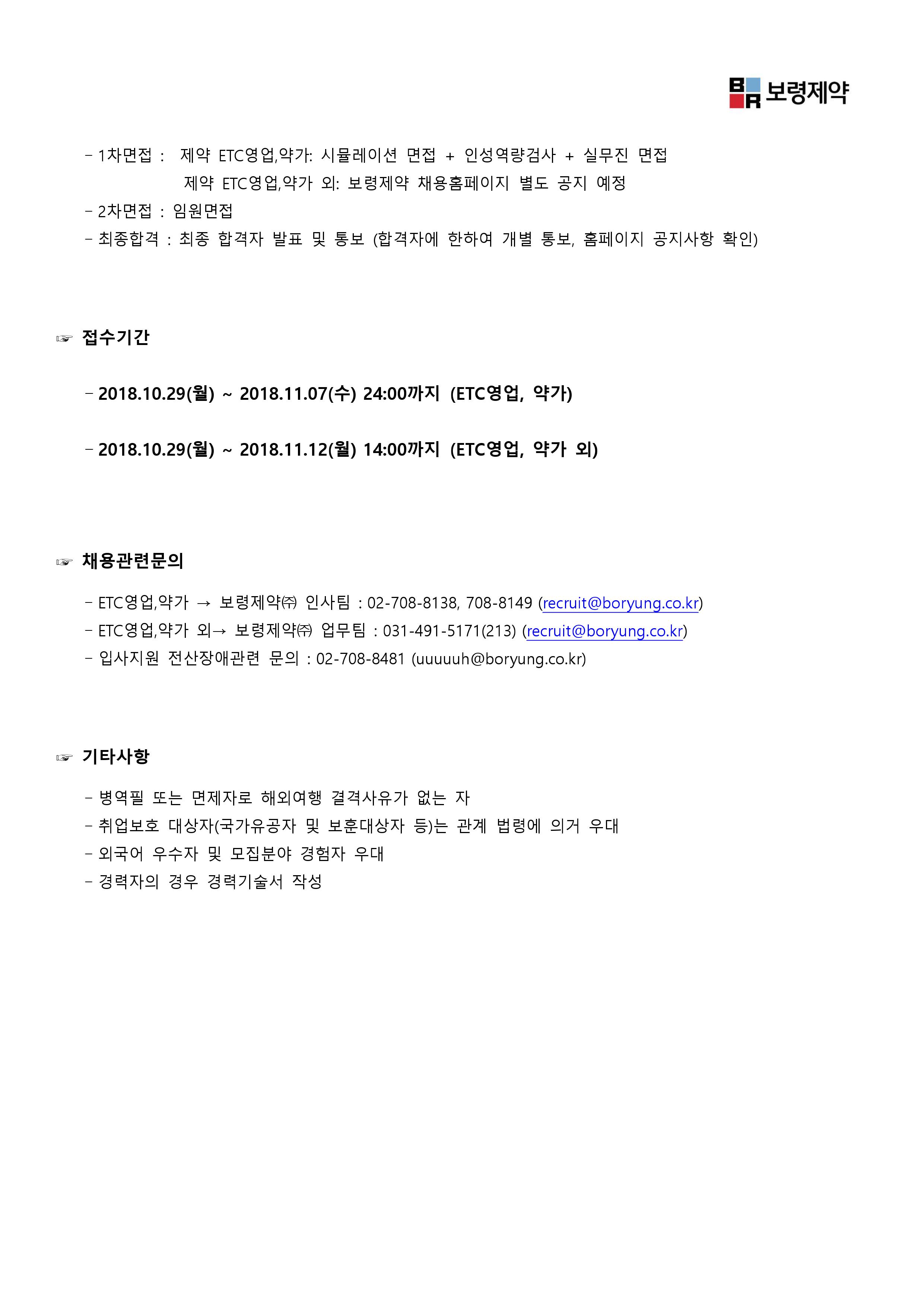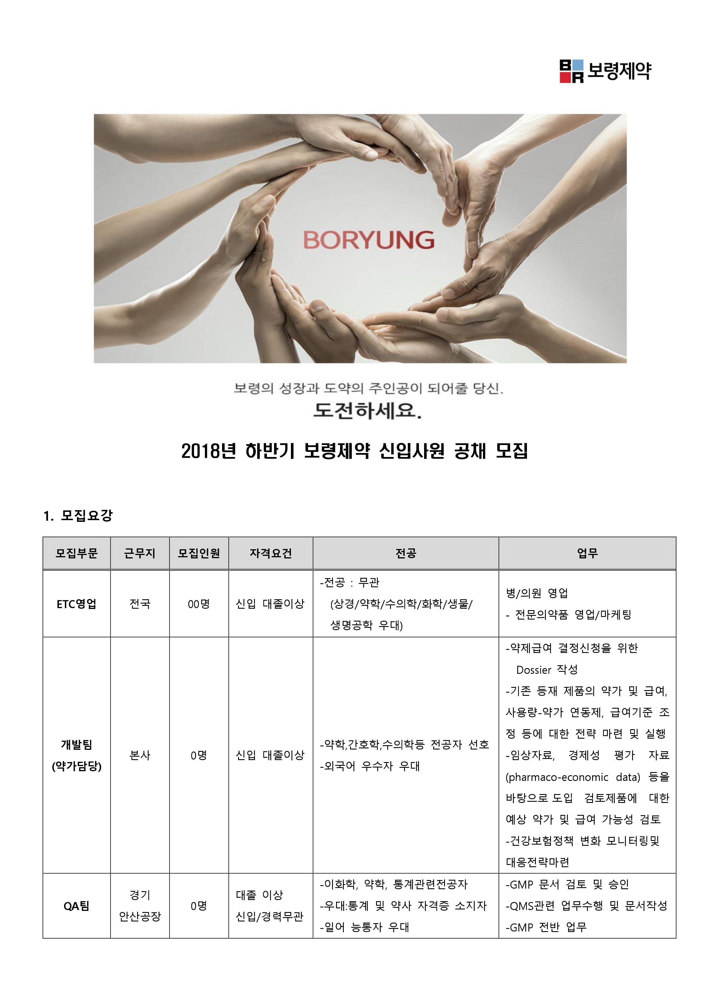 (~11/7,11/12)[보령제약]2018년 하반기 신입사원 공채 모집 안내 글의 상세내용