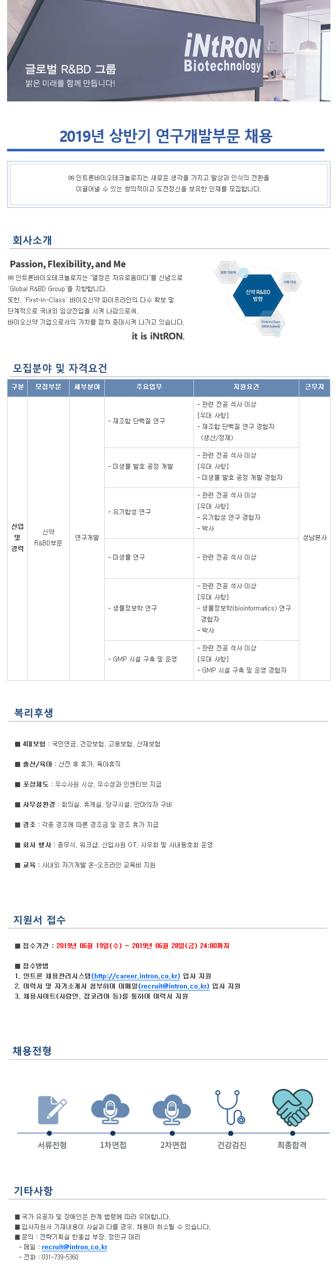 제목 (~6/28)인트론바이오 2019년 상반기 연구개발부분 채용 안내