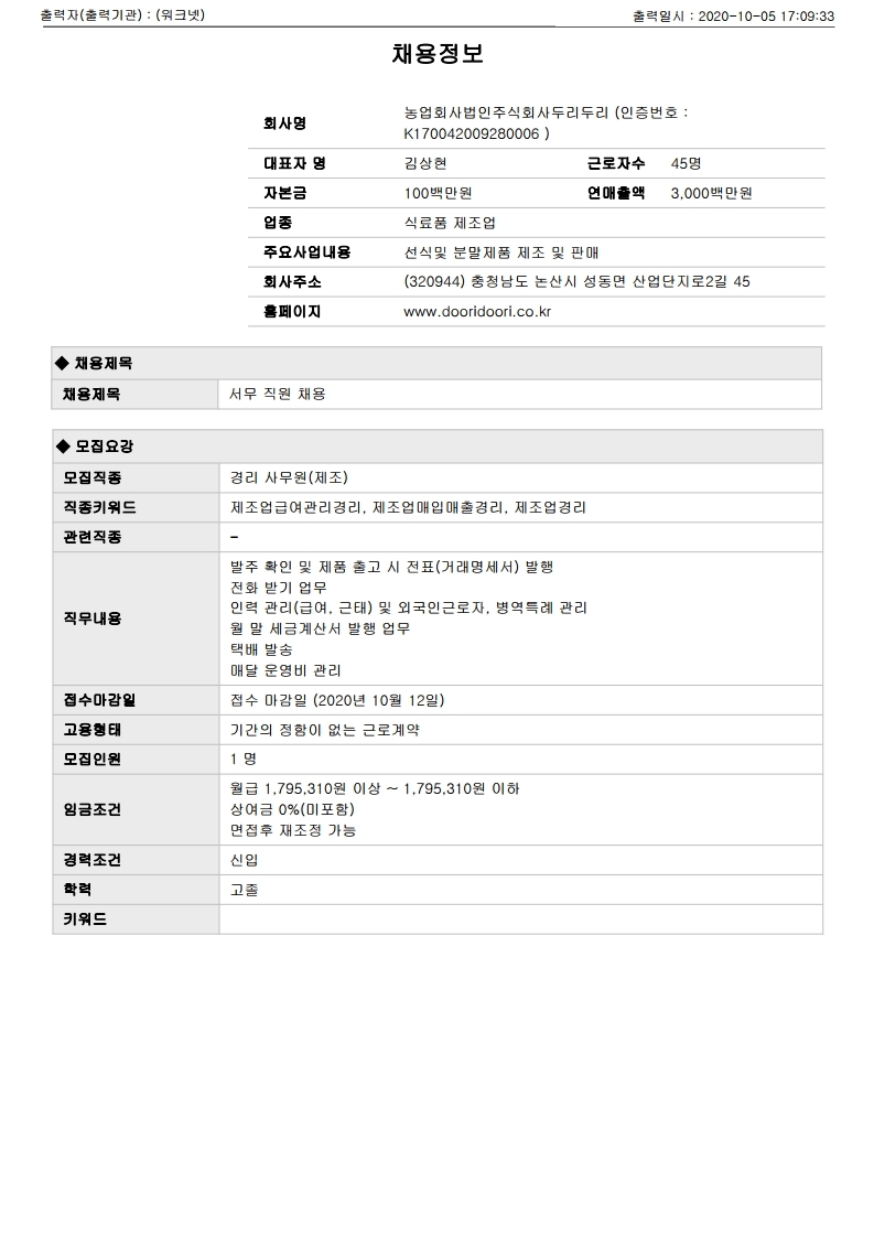 [[농업회사법인주식회사두리두리]서무 직원 채용]