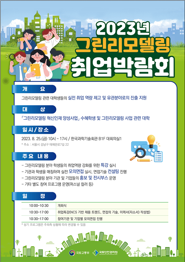 ○ 행사명 : 2023년 그린리모델링 취업박람회 ○ 일시 및 장소 : 2023.8.25.(금) 10:00~17:00 / 한국과학기술회관 B1F 대회의실1 ○ 주요내용 - 그린리모델링 분야 학생들의 취업역량 강화를 위한 특강 실시 - 기관과 학생을 매칭하여 실전 모의면접 실시, 면접기술 컨설팅 진행 - 그린리모델링 분야 기관 및 기업들의 홍보 및 전시부스 운영 등 ○ 문의처(국토안전관리원 그린리모델링센터) - (전화) 055-771-4758, 4822 / (이메일) j2hui@kalis.or.kr, qudtn0404@kalis.or.kr