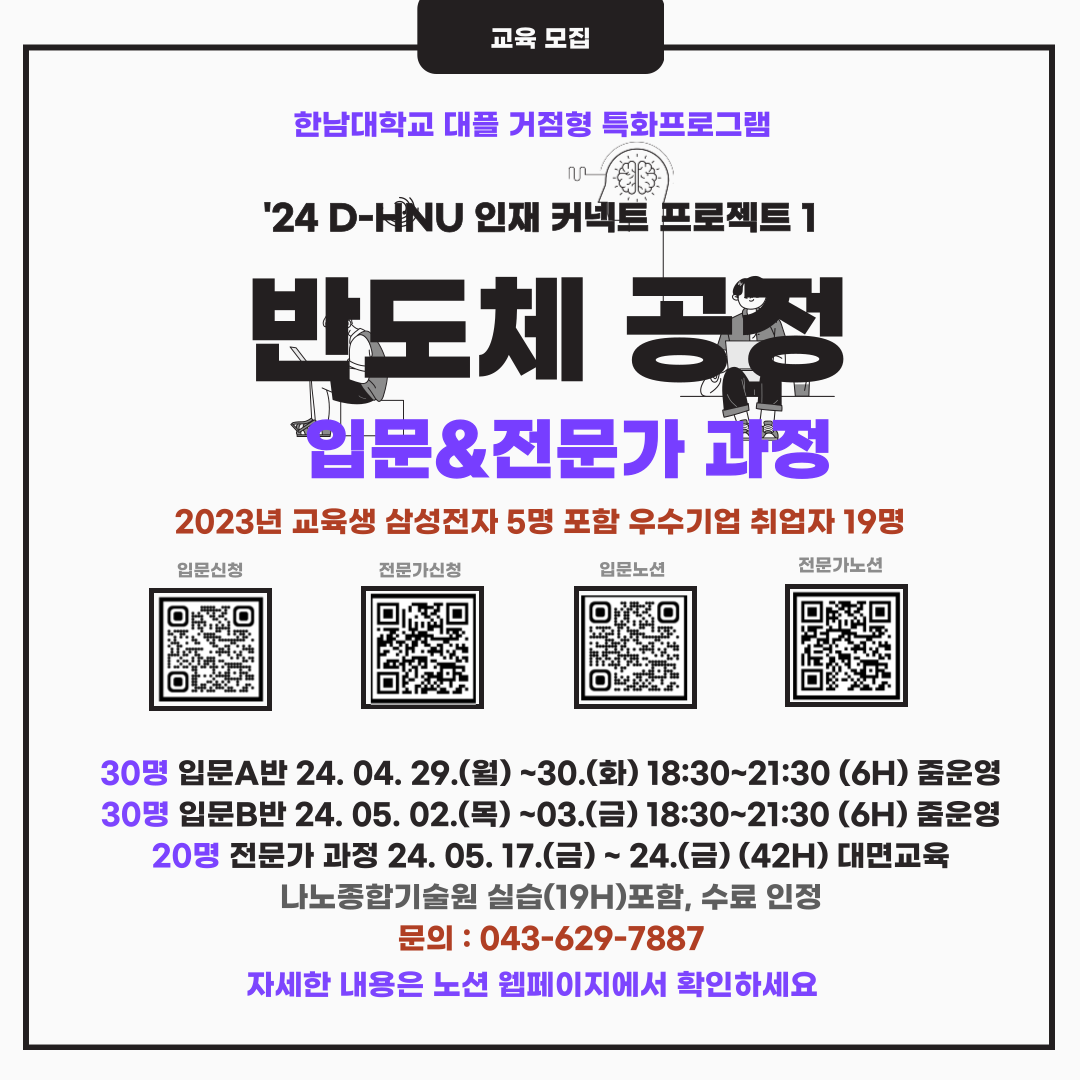 가. 프로그램 : 거점형 특화프로그램 '24 D-HNU 인재 커넥트 프로젝트 1 「반도체 공정 입문 및 전문가 과정」 나. 모집기간 1) 반도체 공정 입문 과정 A반, B반 : 2024. 04. 11.(목) ~ 24.(수) 2) 반도체 공정 전문가 과정 : 2024. 04. 15.(월) ~ 05. 07. (화) ※ 선발과정(서류전형, 면접선발/ 입문(유선), 전문가(대면 또는 온라인 면접)) ※ 선발기준 : 소속, 전공적합성, 지원동기, 교육 후 계획, 기타(어학, 자격, 학점) 다. 운영대상 : 지역청년 (반도체관련 전공 취업준비생, 4학년 이상, 졸업생) 라. 교육혜택 : 무료교육, 수료증 발급(80% 이상 참여자)_전문가 과정 나노종합기술원 수료증 포함 마. 운영일자 1) 반도체 공정 입문 과정 A반(온라인) : 2024. 04. 29.(월) ~ 30.(화) 18:30 ~ 21:30, 6시간 2) 반도체 공정 입문 과정 B반(온라인) : 2024. 05. 02.(목) ~ 03.(금) 18:30 ~ 21:30, 6시간 3) 반도체 공정 전문가 과정(오프라인) : 2024. 05. 17.(금) ~ 05. 24.(금) 8일, 42시간 바. 운영장소 : 한남대학교 인사례교양동 1층 취창업훈련실 A, 나노종합기술원 교육원 및 팹실습실 사. 교육신청(네이버 폼) 1) 반도체 공정 입문 과정 A반, B반 : https://naver.me/FVBMfh7G 2) 반도체 공정 전문가 과정(4월15일부터): https://naver.me/5XTsGwiE 아. 자세한 내용은 첨부 파일 참조 자. 담당자 : 한남대학교 대학일자리플러스센터(042-629-7887) dreamjob12@hnu.kr