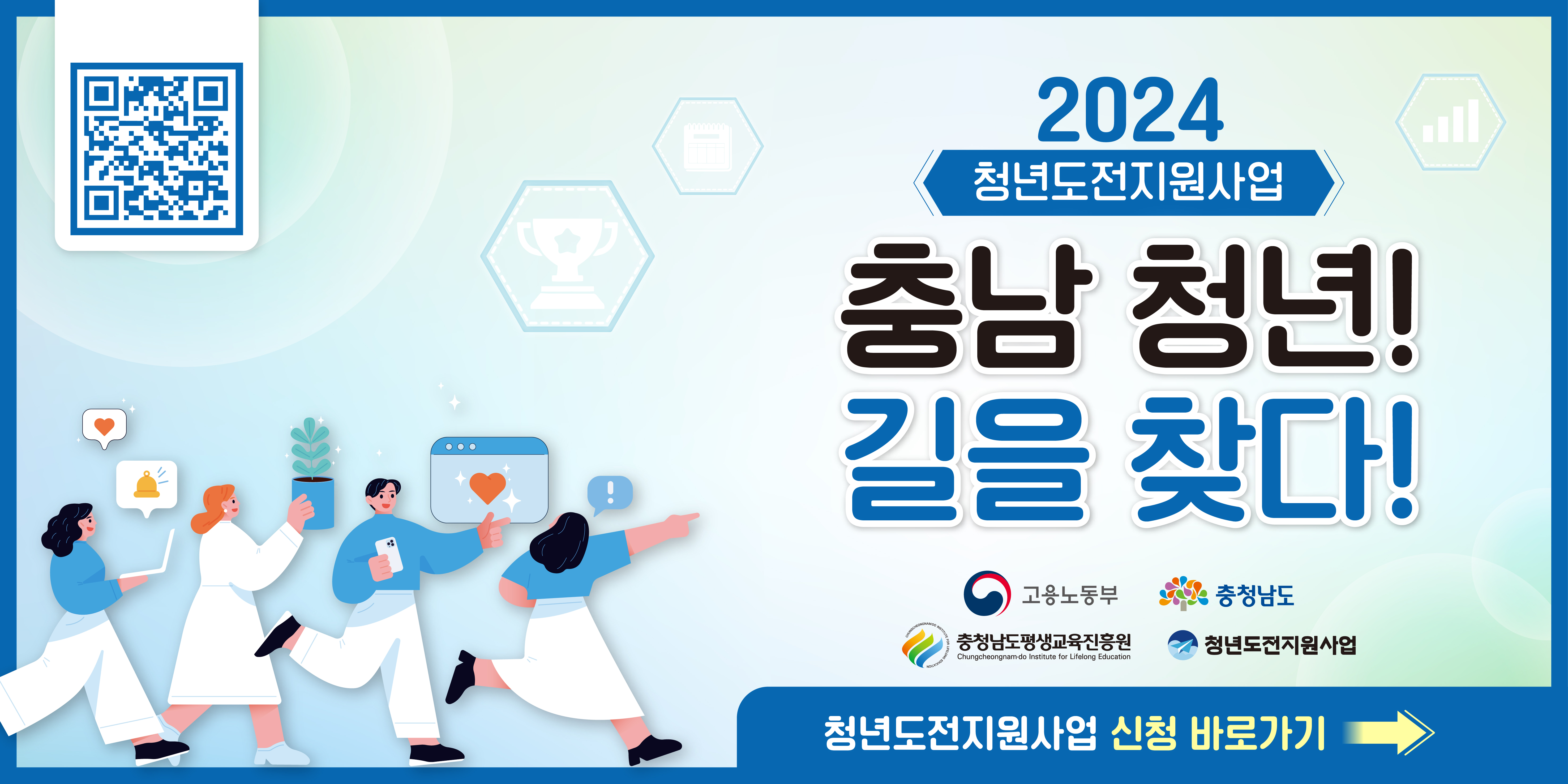 | 제목 | [재단법인충청남도평생교육인재육성진흥원] 2024년 충남 청년도전지원사업 참여자모집 | ||||||