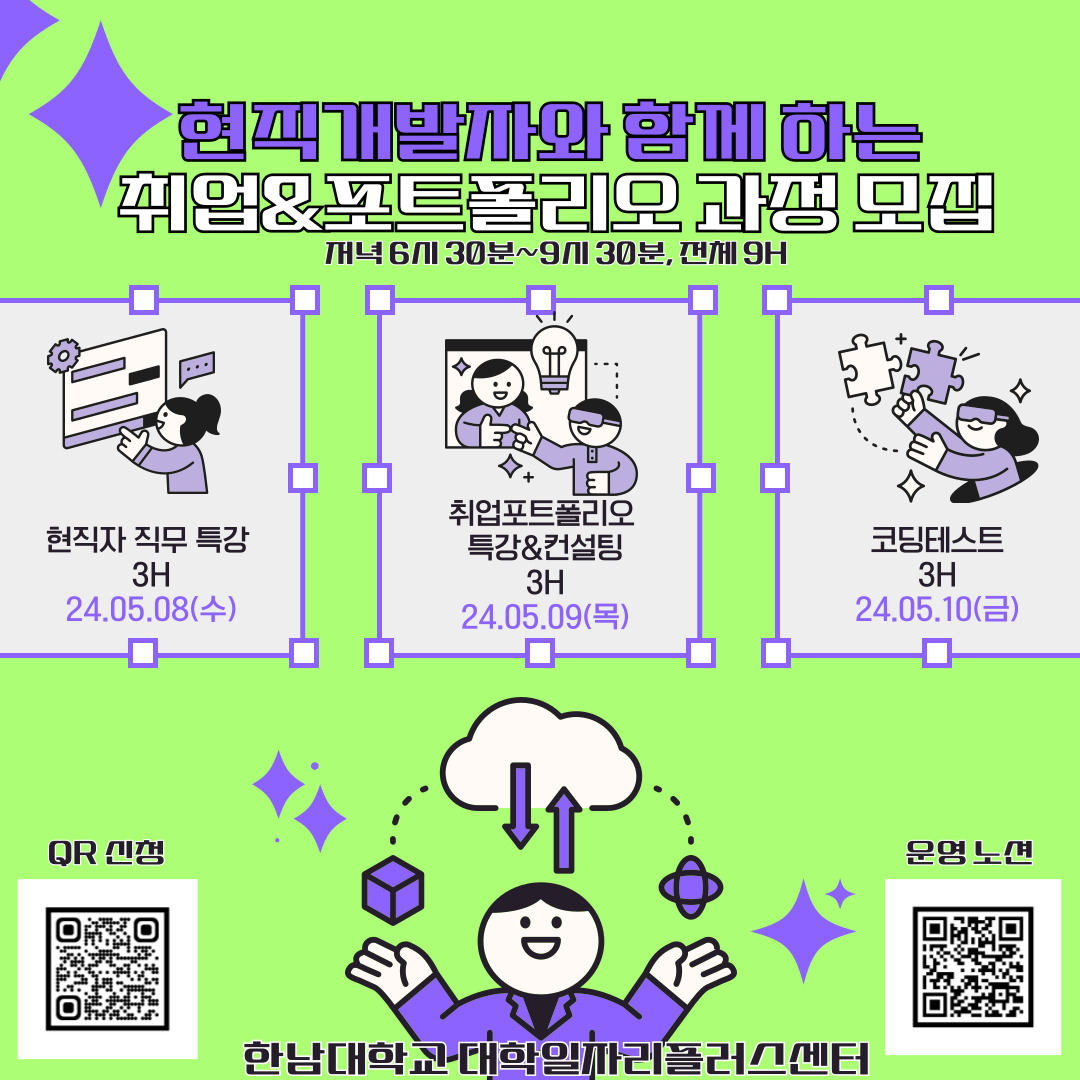 가. 프로그램 : 거점형 특화프로그램 '24 D-HNU 인재 커넥트 프로젝트 「현직 개발자와 함께 하는 취업&포트폴리오 온라인 교육(9H) 」 나. 모집기간 : 2024. 04. 15(월) ~ 05. 07.(화) ※ 신청자는 유선 상담 필수 (모집 기간 중 개별 유선상담)