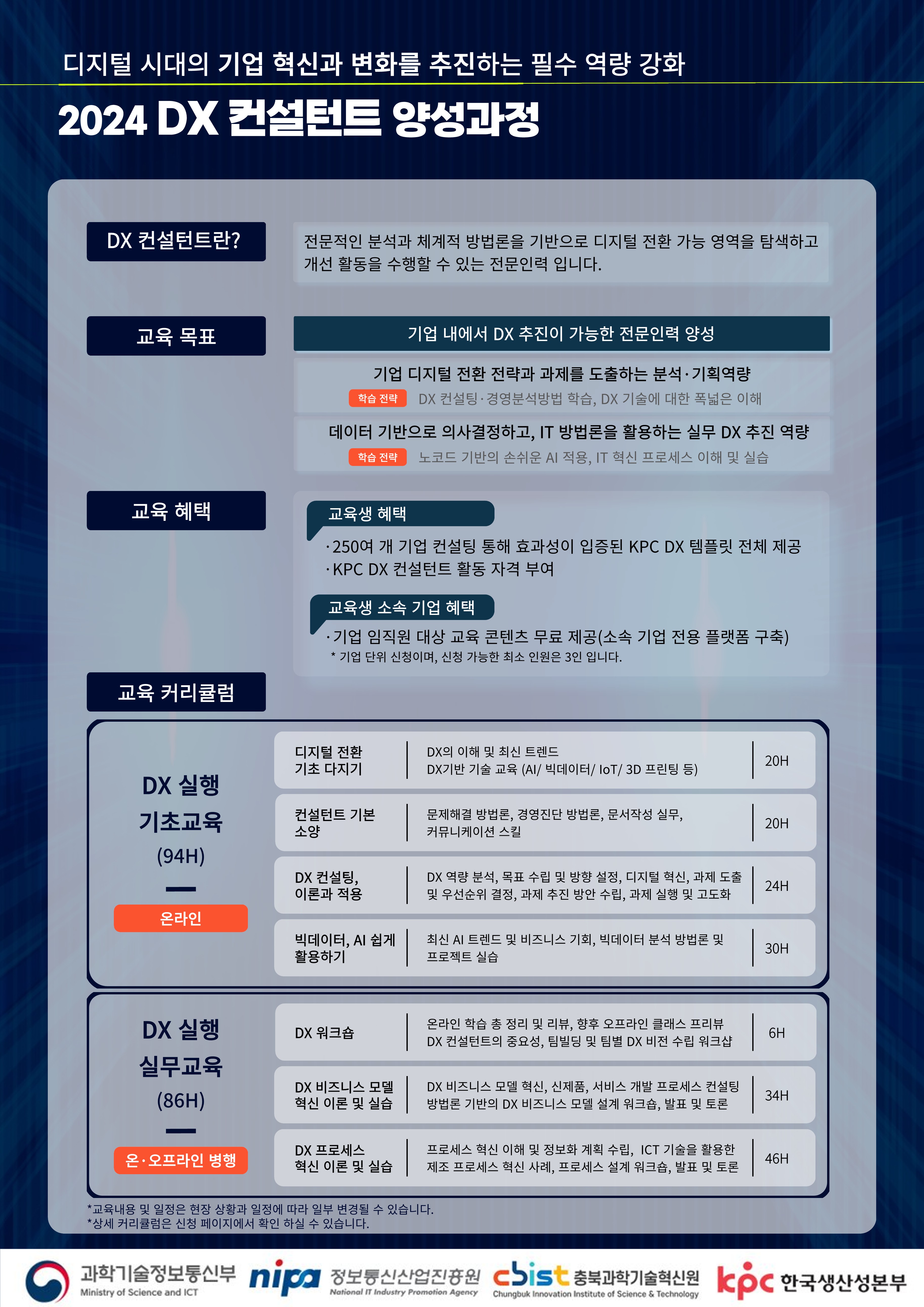 | 제목 | 충북 iDX 협업지원센터「2024 디지털 전환(DX) 컨설턴트 양성과정」 교육생 모집 | ||||