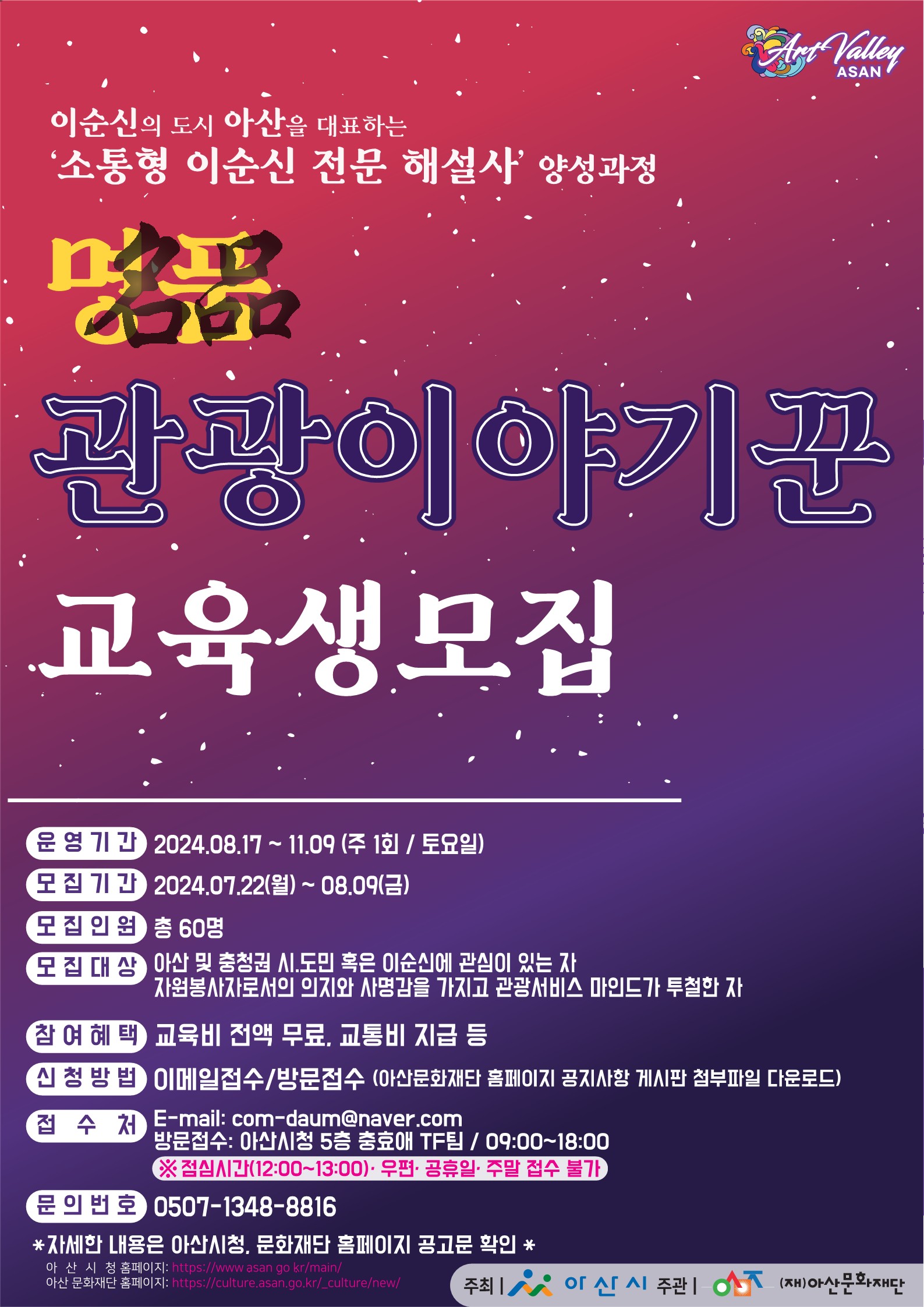 (재)아산문화재단 '명품관광이야기꾼 육성사업' 교육생 모집 글의 상세내용