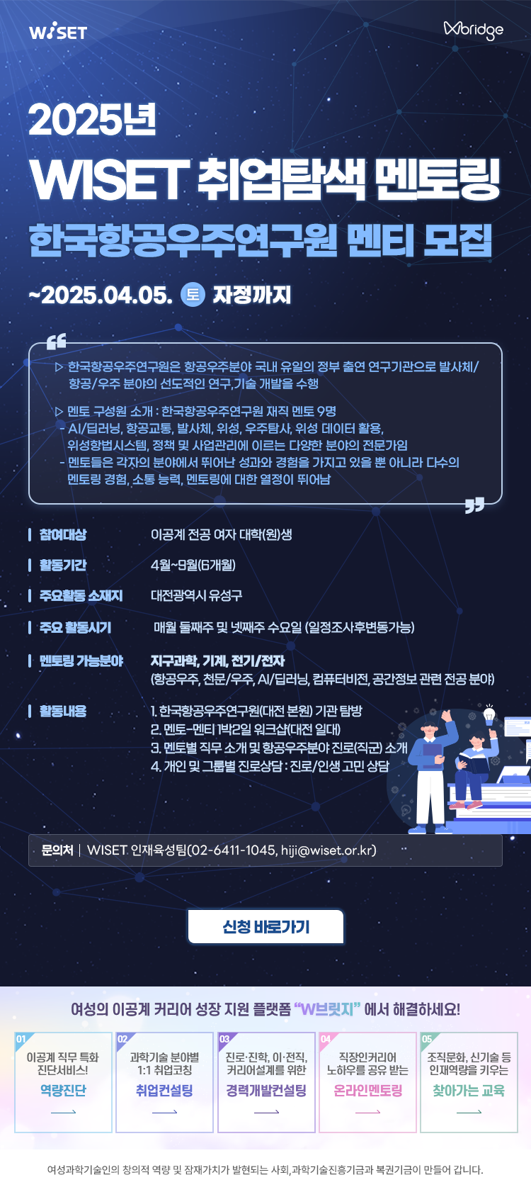 제목 2025년 WISET 취업탐색 멘토링 참여 이공계 대학(원)생 멘티 모집(지구과학, 기계, 전기/전자)