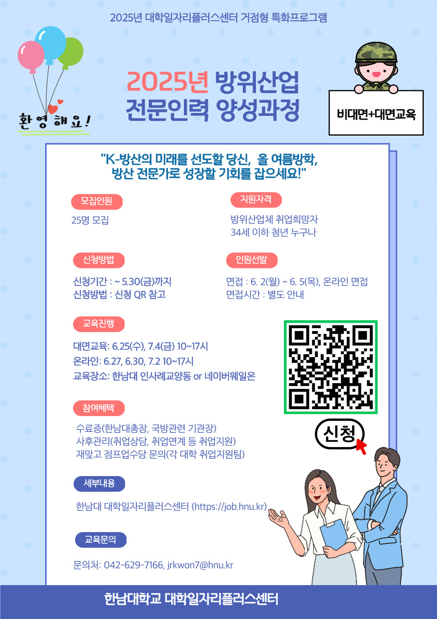나. 교육기간 : 2025. 6. 25(수) ~ 7. 4(금) 10:00~17:00 (하계방학 기간) 다. 교육방법 1) 대면교육 : 6. 25(수), 7. 4(금) 2) 실시간 온라인(향후 안내) : 6. 27(금), 6. 30(월), 7. 2(수) 라. 교육장소 : 한남대학교 인사례교양동 1층 취창업훈련실 D, 실시간 온라인 마. 참여대상 : 방위산업체 관련 취업희망자, 34세 이하 청년 바. 참여인원 : 25명 사. 교육신청 및 인원 선발 1) 신청방법 : 네어버폼 / https://naver.me/5FmfA76r 2) 신청기간 : 4월 ~ 5. 30(금) 3) 면접기간 : 6. 2(월) ~ 6. 5(목), 온라인 면접(개별 통보 예정) ※ 면접일정은 1차 서류통과자에 대해 별도 안내 ※ 선발기준 : 전공적합성, 지원동기, 교육 후 계획, 기타(어학, 자격, 학점) 4) 선발발표 : 2025. 6월 2주차(개별 통보)