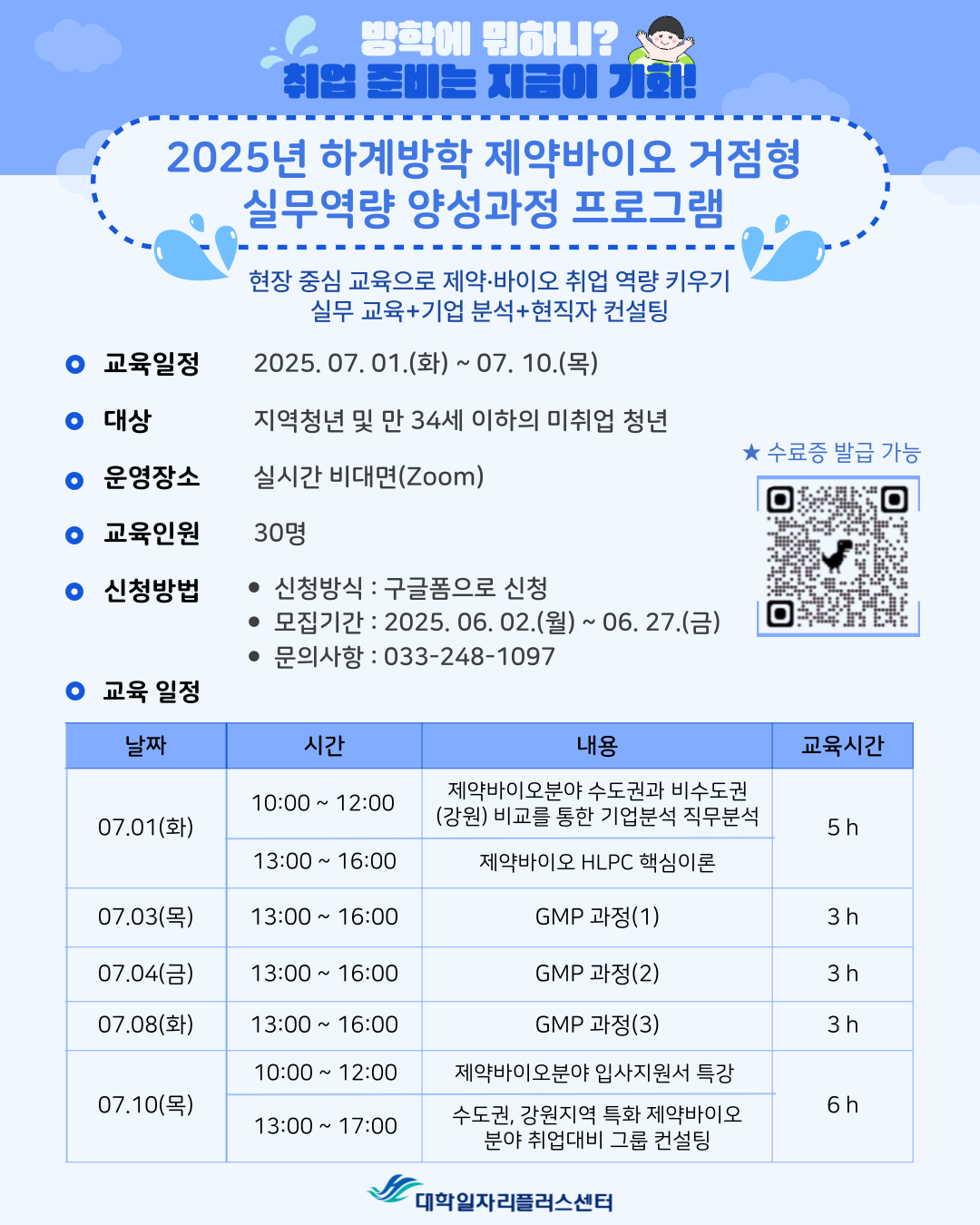가. 프로그램명: [거점형] 2025년 하계방학 제약바이오 거점형 실무역량 양성과정 나. 목적 : 제약바이오 분야 직무 교육을 통한 실질적 취업 준비 역량 강화 다. 모집대상 : 지역청년 및 만 34세 이하의 미취업 청년 라. 모집인원 : 30명 이내 마. 운영기간 : 2025. 07. 01.(화) ~ 07. 10.(목), 총 20시간 바. 운영방식 : 비대면 실시간 강의 (ZOOM 활용) 사. 주요내용 : ※ 붙임 참조 (시행계획, 프로그램 세부 내용)