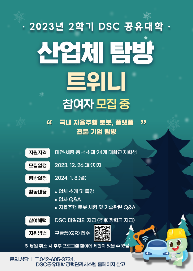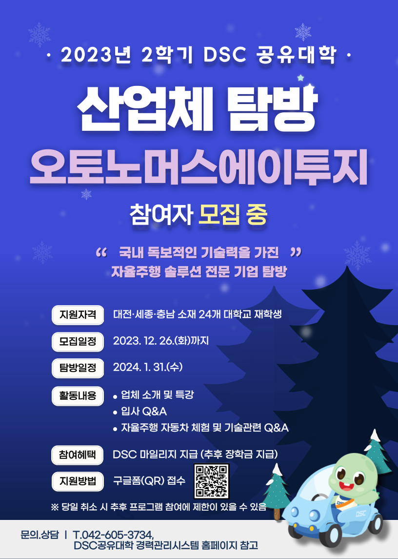 <2023년 DSC 공유대학 산업체 탐방 안내> 가. 프로그램명: DSC 공유대학 산업체 탐방 프로그램 나. 참여대상: DSC 공유대학 24개 참여대학 소속 재학생 1) 트위니: 2024. 1. 8.(월) 2) 한국자동차연구원: 2024. 1. 25.(목) 3) 오토노머스에이투지: 2024. 1. 31.(수) 다. 모집인원: 기업당 15명(선착순 모집) 라. 신청기간 및 방법 1) 신청기간: ~2023. 12. 26.(화) 2) 신청방법: 구글 설문지 링크 접속 - 트위니(https://forms.gle/ycTDwzVYh3pgPHg57) - 한국자동차연구원(https://forms.gle/QnUB9RcTvL6wqYgc7) -오토노머스에이투지(https://forms.gle/15hD5qf2Rh4XaU4w7) 마. 참여혜택 1) DSC공유대학 마일리지 지급(추후 장학금 지급)