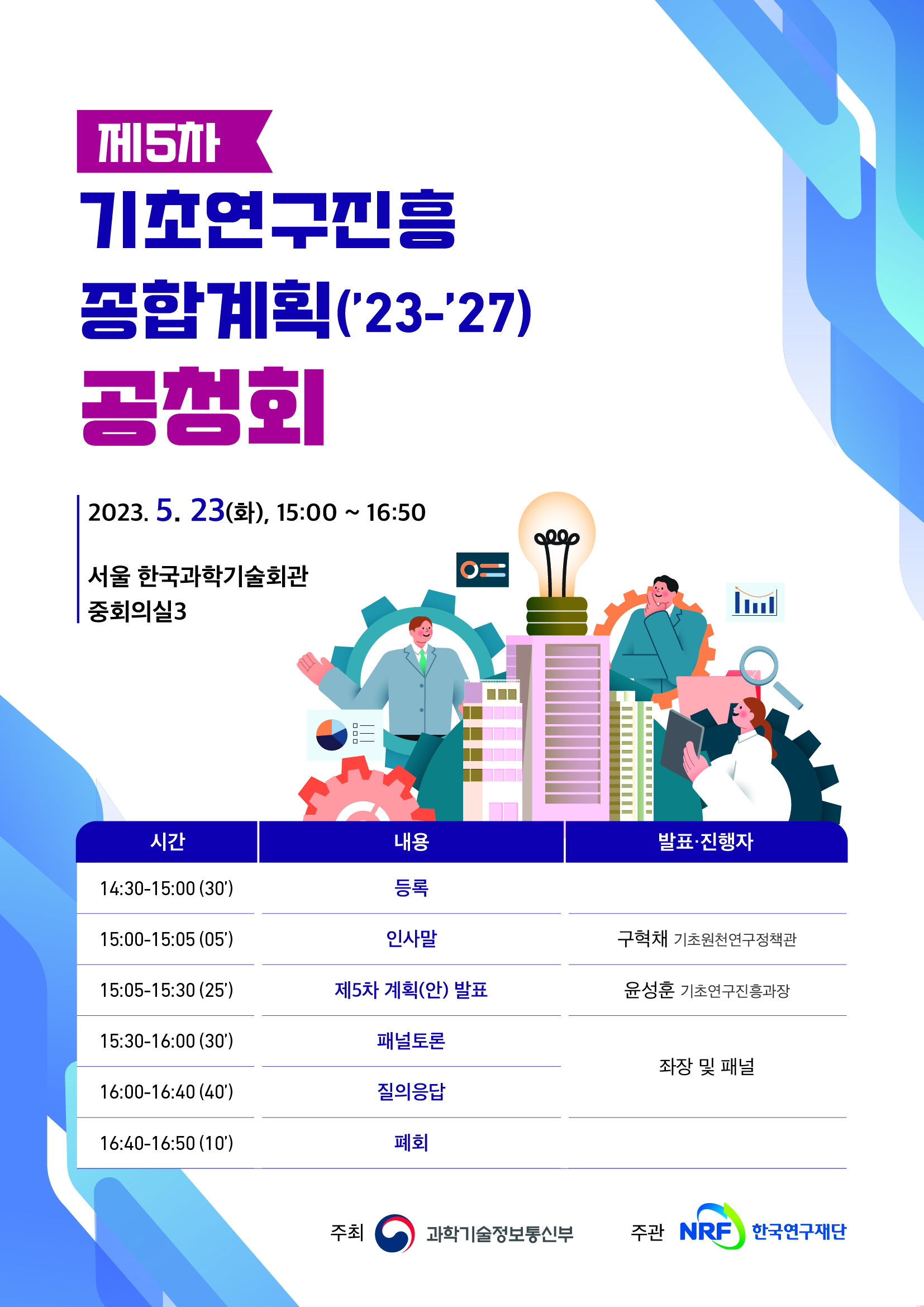 | 제목 | 제5차 기초연구진흥종합계획(2023~2027) 공청회 개최 안내 | ||||
