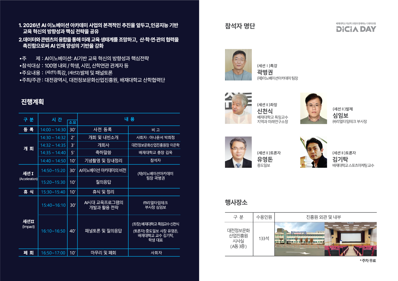 □ 행사 목적 ㅇ 2026년 AI 이노베이션 아카데미 사업의 본격적인 추진을 앞두고, 인공지능 기반 교육 혁신의 방향성과 핵심 전략을 공유 ㅇ 데이터와 콘텐츠의 융합을 통해 미래 교육 생태계를 조망하고, 산‧학‧연‧관의 협력을 촉진함으로써 AI 인재 양성의 기반을 강화 □ 행사 개요(안) ㅇ (일시/장소) ʼ25. 9. 30.(화) 14:30~17:00 / 대전정보문화산업진흥원 시사실 ㅇ (주 제) AI 이노베이션: AI기반 교육 혁신의 방향성과 핵심전략 ㅇ (참석대상) 100명 내외 / 학생, 시민, 산학연관 관계자 등 ㅇ (주요내용) (세션1)특강, (세션2)발제 및 패널토론 ㅇ (주최/주관) 대전광역시, 대전정보문화산업진흥원, 배재대학교 산학협력단