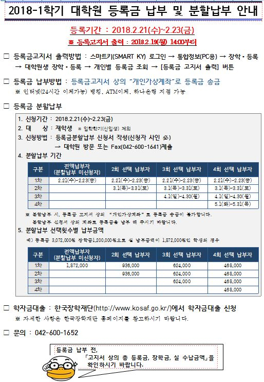 ※등록금 분할납부를 하고자 하시는 분들께서는 "등록금 납부 기간(2018.02.21(수)~2.23(금))" 중 등록금분할납부신청서를 제출해 주시기 바랍니다.
