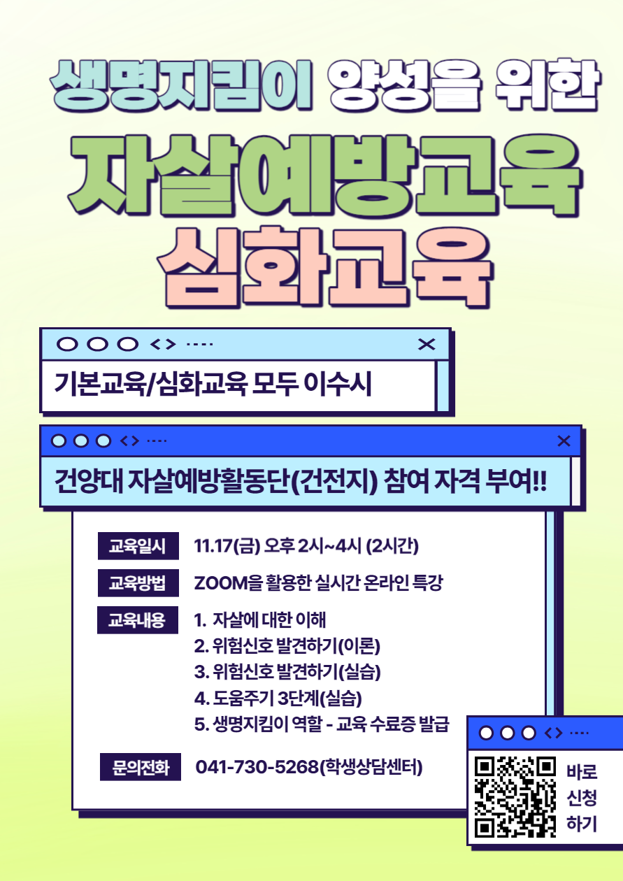 『 11월 생명지킴이(Gate Keeper) 양성을 위한 자살예방교육(심화) 안내 』글의 상세내용을 확인하는 표로 제목, 부서명, 등록일, 조회, 첨부, 내용으로 나뉘어 설명합니다.