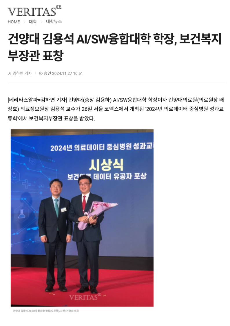 『 김용석 AI/SW융합대학장 보건복지부장관 표창 수상 』글의 상세내용을 확인하는 표로 제목, 부서명, 등록일, 조회, 첨부, 내용으로 나뉘어 설명합니다.