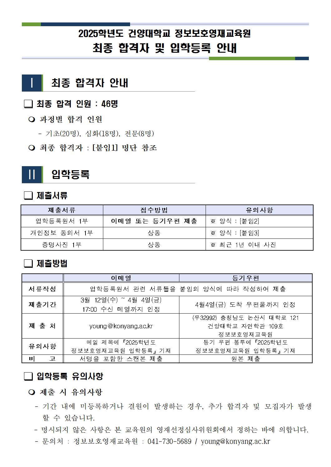 | 제목 | 2025학년도 건양대학교 정보보호영재교육원 최종합격자 및 입학등록 안내 | ||||