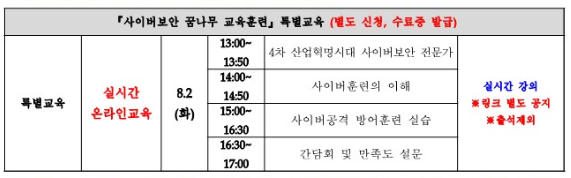 사이버보안 꿈나무 교육훈련 특별교육 모집 안내 2022학년도 정보보호영재교육원에서 집중학기 특별프로그램으로 사이버안전훈련센터에서 특별교육 프로그램을 운영하오니 많은 참여 바랍니다. □ 추진 계획(안) ○ 대상: 충청권 정보보호영재교육원 재학생 ○ 장소: 온라인 ○ 일시: 8월 2일 화요일(예상) ○ 강의: 사이버안전훈련센터 센터장, 실장 ○ 특전: 수료증 발급 ○ 신청: - 신청기간 : ~ 07.27(수) 까지 - https://forms.gle/eMs8ZFpawFCqGMei7 □ 교육훈련 내용 ○ 소요 시간: 총 4시간 ○ 프로그램
