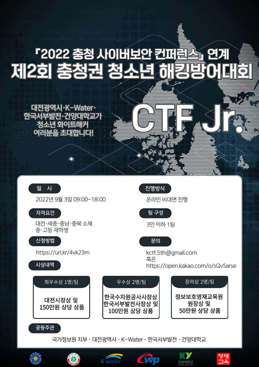 정보보호영재교육원에서 국가정보원 지부, 대전시, K-Water, 한국서부발전이 공동으로 주관하는 제2회 CTF Jr.에 대전, 세종, 충남, 충북 소재 중˙고등 재학생들을 초대합니다. |