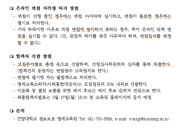 | 제목 | 2023학년도 건양대학교 정보보호영재교육원 서류 평가 결과 및 면접평가 일정 안내 | ||||