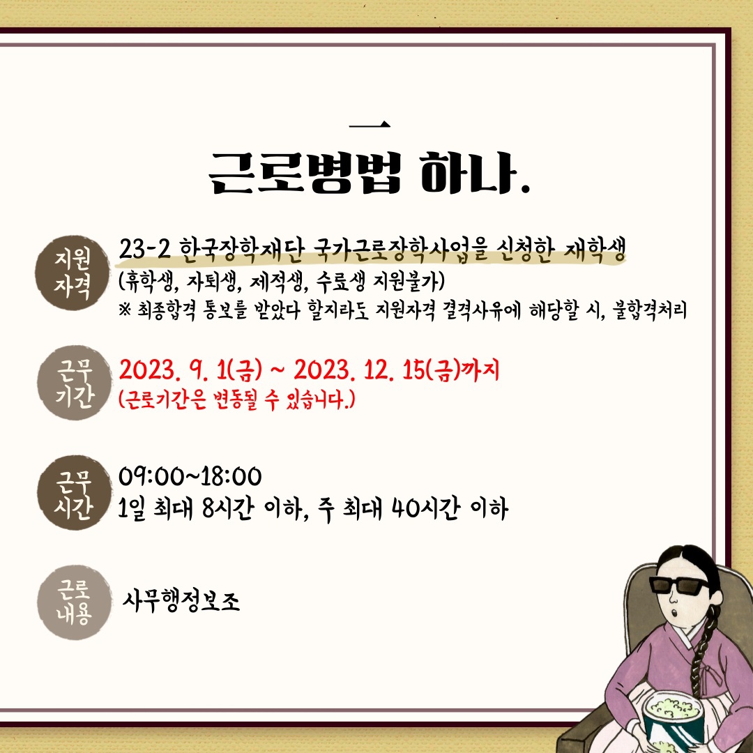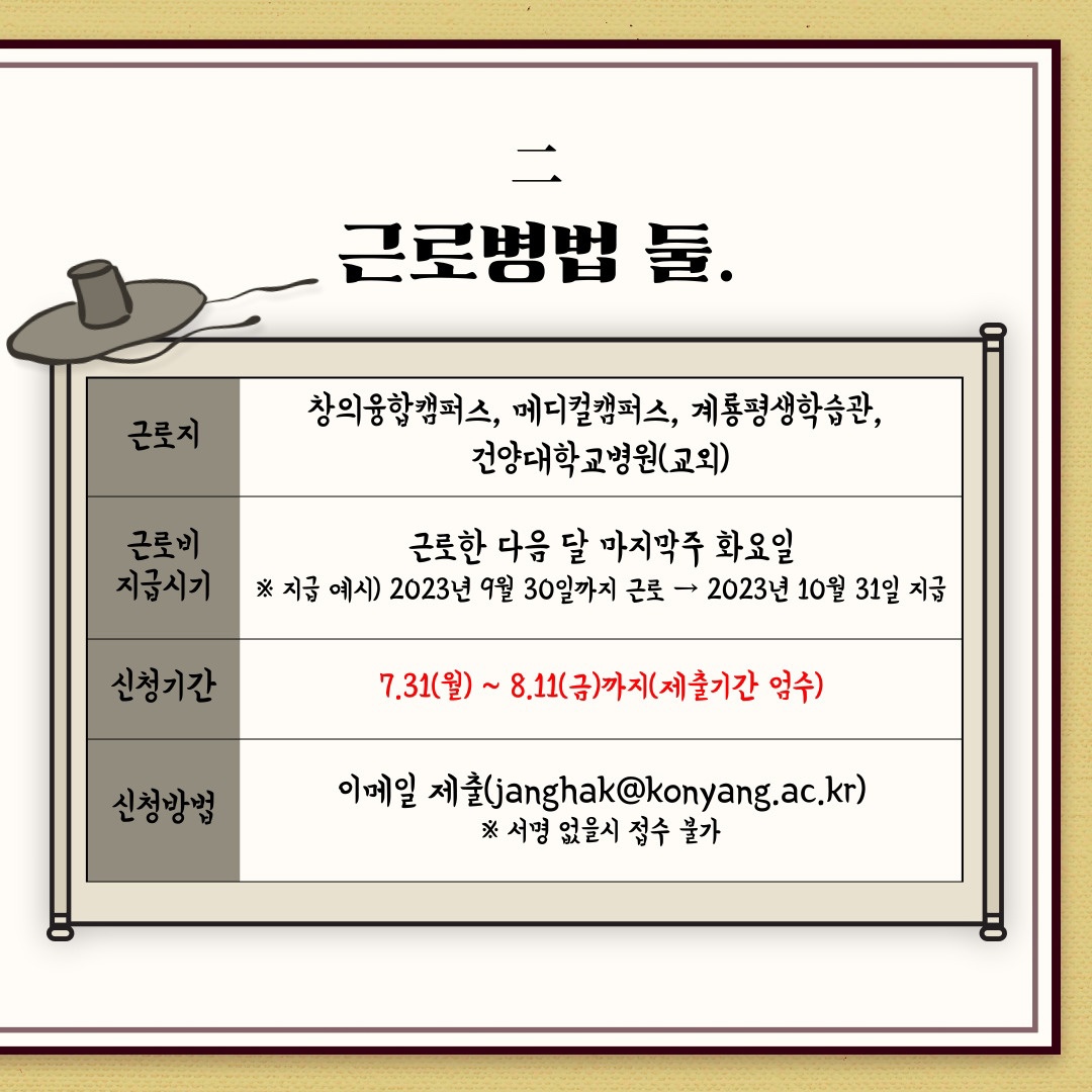| 제목 | [안내] 2023학년도 2학기 중 국가근로장학생 모집안내 (교내, 건양대병원) | ||||