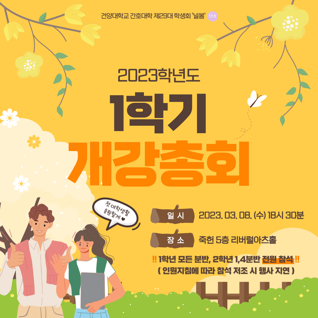 안녕하세요. 건양대학교 간호대학 제29대 널봄 학생회입니다. ✔️ 일시 : 3월 8일 (수) 오후 6시 30분 ✔️ 장소 : 죽헌 5층 리버럴아츠홀 ✔️ 필수참여 인원 : 1학년 전원 , 2학년 1,4분반 (랜덤 선정) 월별 달력에 표기되어 있던 개강총회가 7일 (화)에서 ❗️8일 (수)로❗️변경되었음을 알려드립니다. ⭐️개강총회 인원지침에 따라⭐️ 필수참여 학년에 해당하는 학우분들의 참석이 저조할 경우 행사가 지연될 수 있으니 필히 시간에 맞춰 참석해 주시기 바랍니다. 2023년 1학기 사업기획안 및 학우분들이 납부해주신 학생회비의 추후 사용계획에 대해 발표하는 행사인 만큼 많은 참석으로 자리를 빛내주시기 바랍니다. 학우 여러분의 1학기 학교생활을 널봄 학생회가 응원하겠습니다:) 항상 학우분들을 위한 시선으로 바라보는 ‘Nur봄’이 되겠습니다. 감사합니다. |