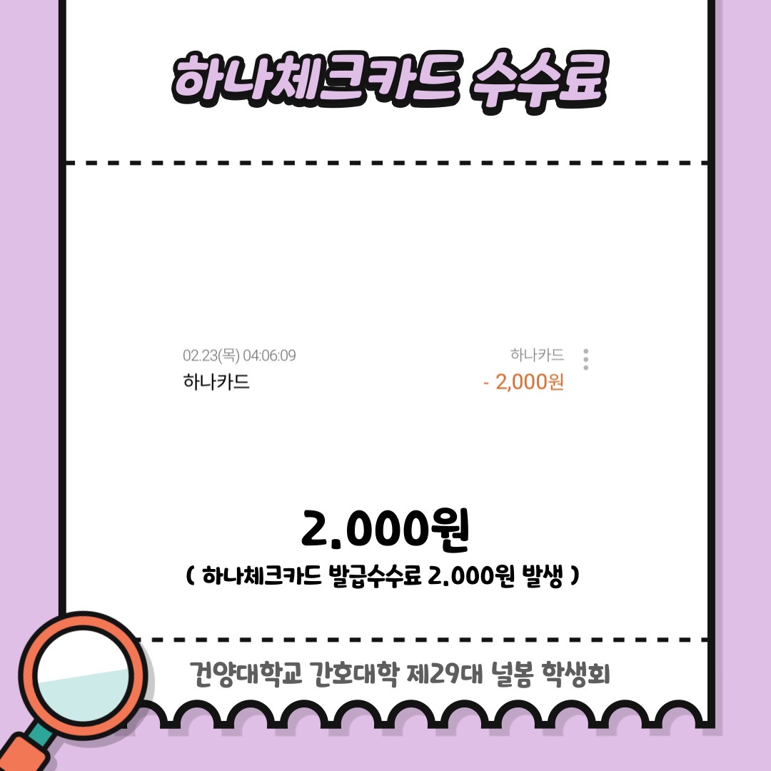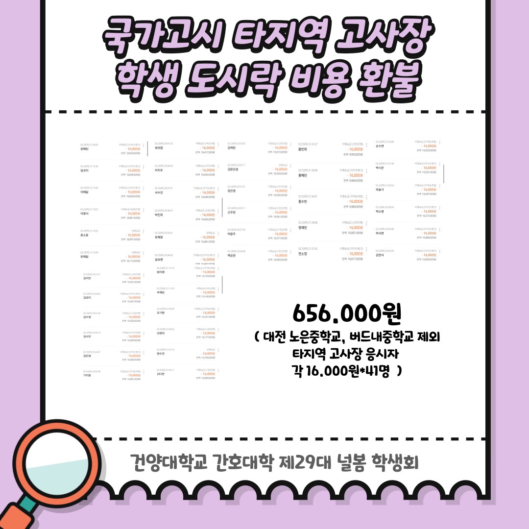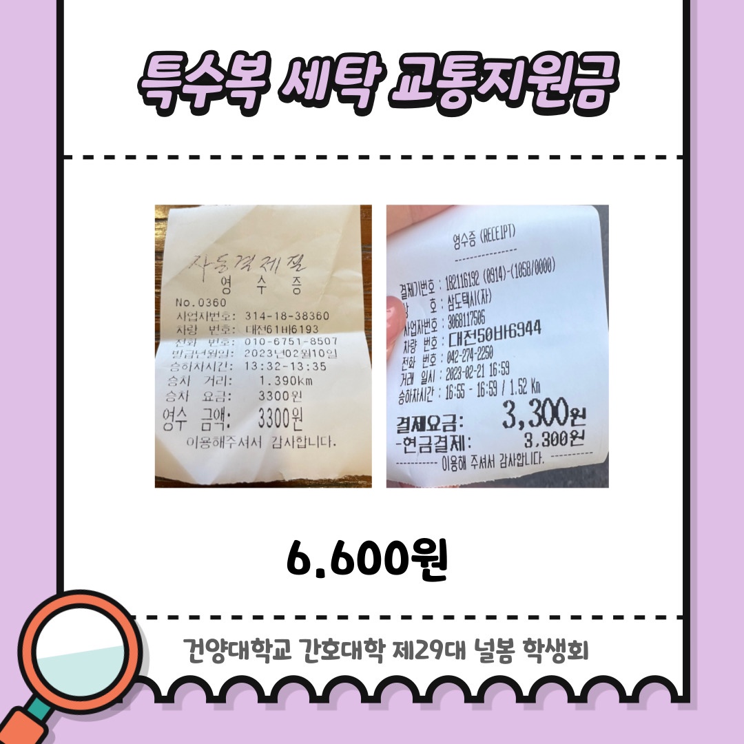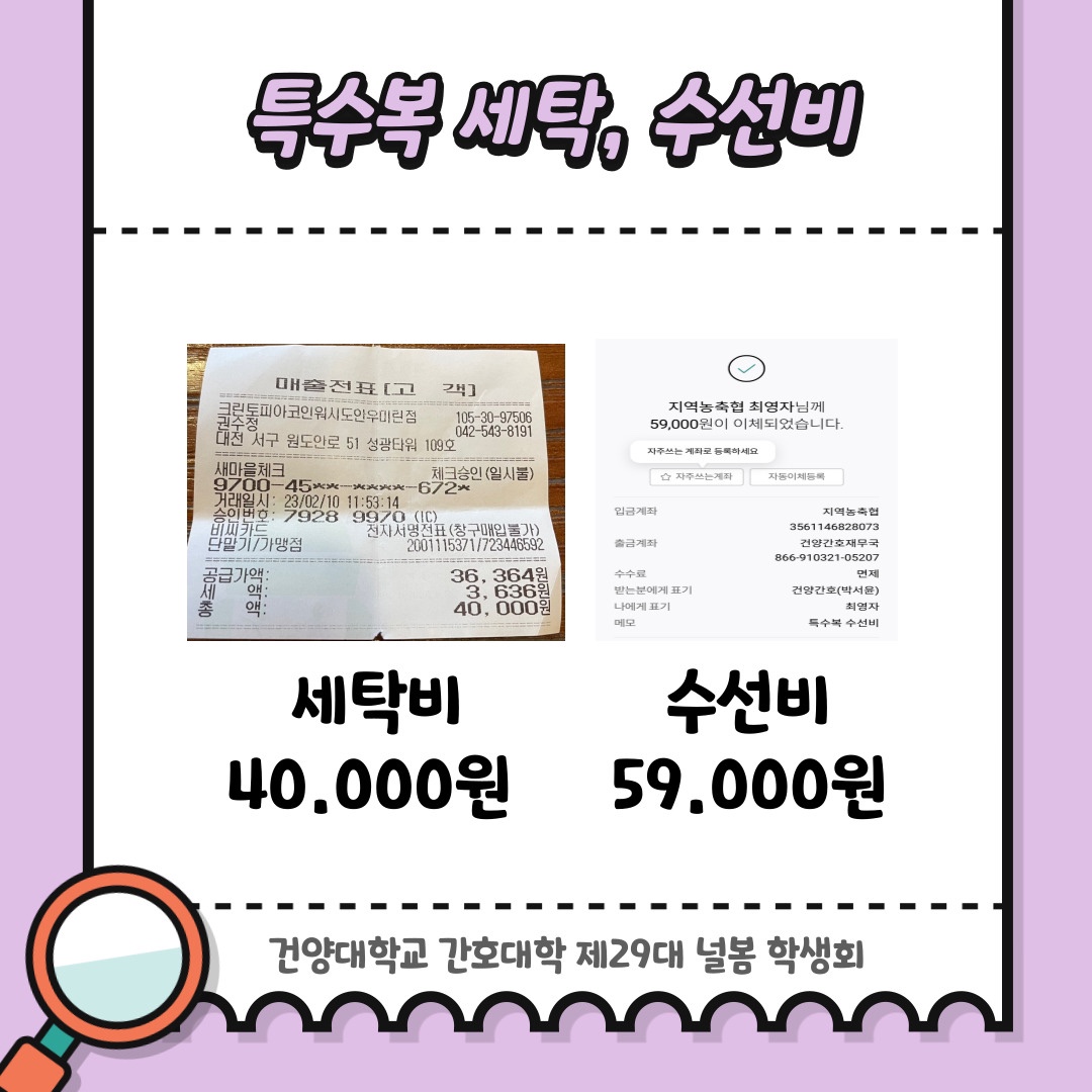 2월 학생회비 사용 내역 공지 안녕하세요. 건양대학교 간호대학 제29대 널봄 학생회입니다. 2월 학생회비 사용 내역입니다. 월별 학생회비 사용 내역은 매월 초에 공지될 예정이며, 보다 투명한 널봄 학생회가 될 수 있도록 노력하겠습니다. 학생회비 사용 내역은 다음과 같습니다. - 국가고시 타지역 고사장 학생 도시락 비용 환불 - 하나체크카드 수수료 - 특수복 세탁 교통지원금 - 특수복 세탁, 수선비 - 덧가운 구매 항상 학우분들을 위한 시선으로 바라보는 ’Nur봄‘이 되겠습니다. 감사합니다.