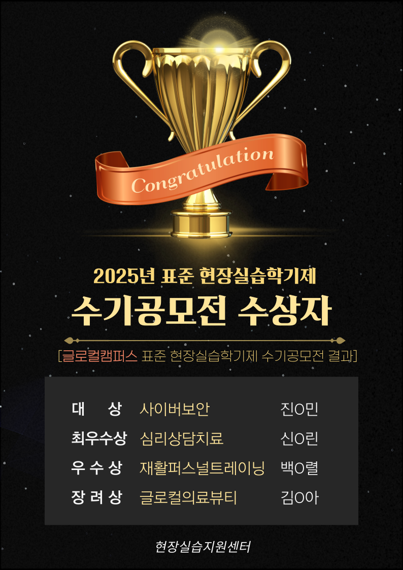 | 제목 | ★ 2025학년도 표준 현장실습학기제 수기공모전 결과 발표 안내(글로컬) | ||||